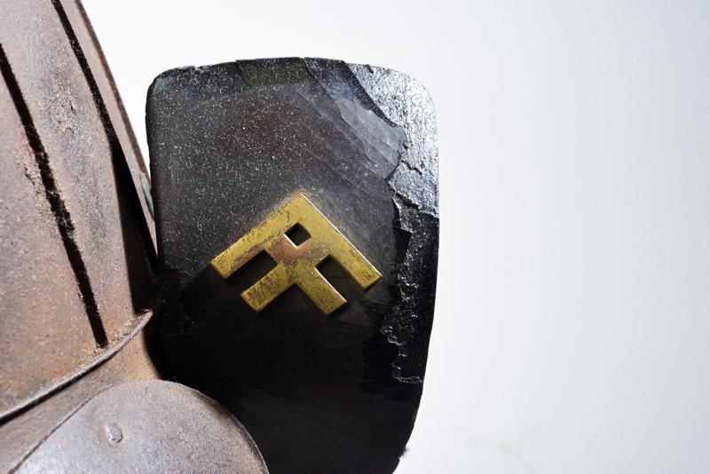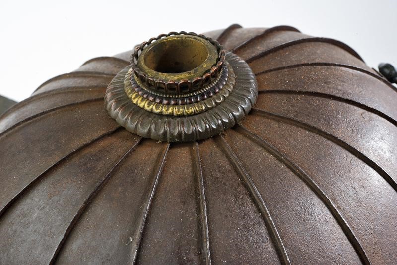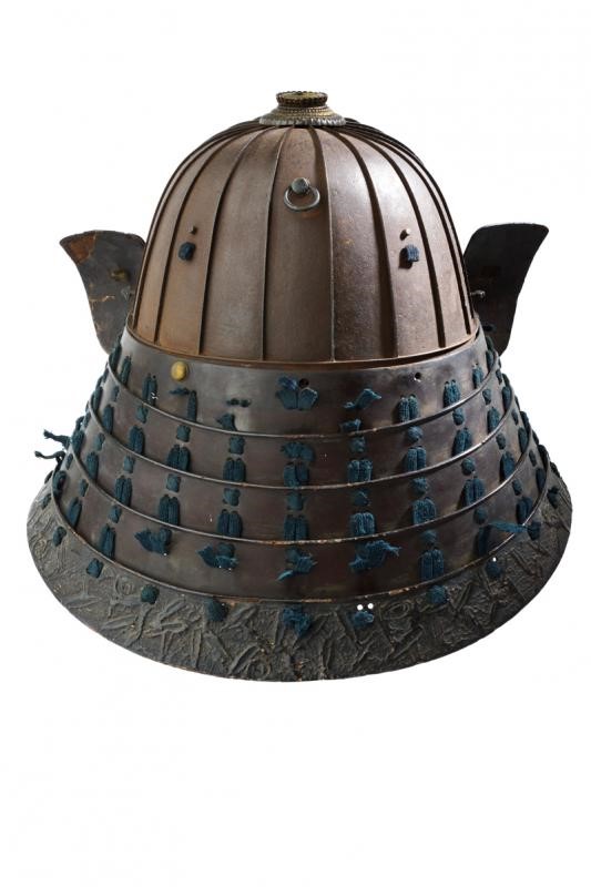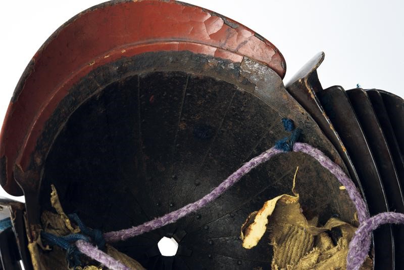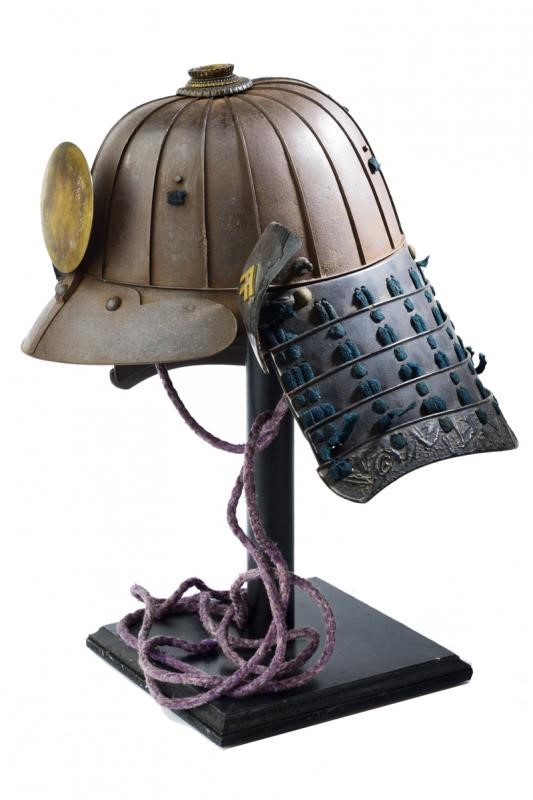 Eighteen-plated iron hachi, beautiful thehen kanamono composed of silver-plated and gilded copper sectors, four-plated, brown-lacquered hineno shikoro, the last one with streaked lacquer, sugake-style, green silk lacing. Large fukigaeshi with gilt mon, mabezashi with original disc-shaped maedate. Slightly damaged.