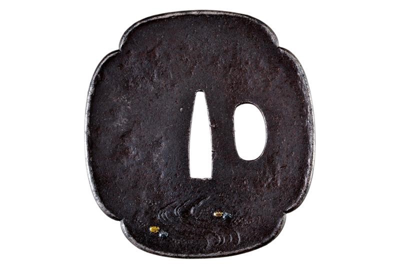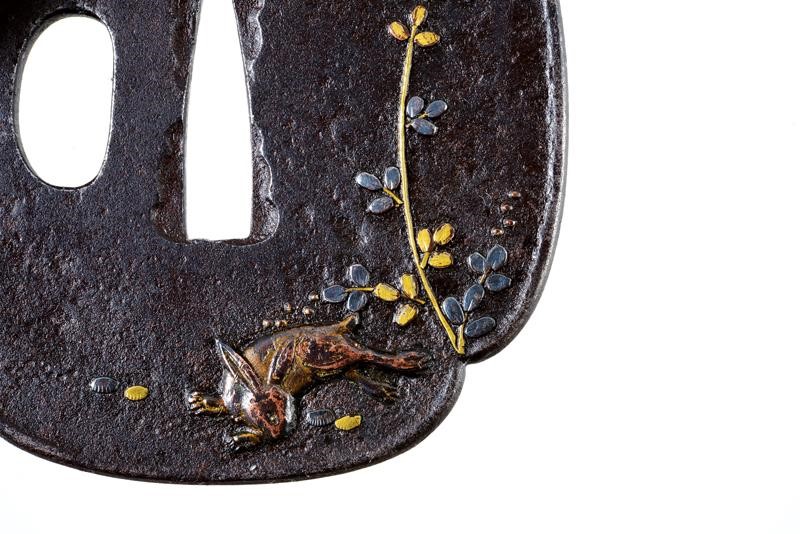 Of mokko-gata iron, niku-bori, iore-taka-zogan, uchi-gaeshi-mimi, the surface lightly worked in tsuchimei. Decorated with a running hare amid autumn herbs and, at the top, the moon half-covered by clouds, on the ura side a small stream with leaves. It is the typical autumn landscape that inspired Tsuchija Yasuchika. The Aizu school originated in Iwashiro, one of the provinces of northern Japan, thanks to a series of artists who moved there. The styles are varied and it is therefore difficult to distinguish them. Late Edo period.