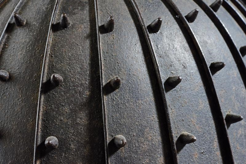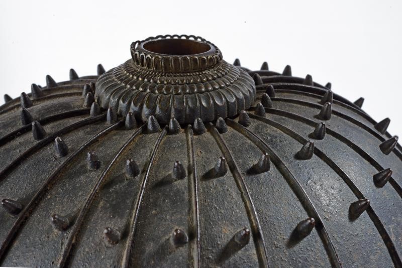Hoshi bachi kabuto with 24 iron plates and spikes, smooth mabezashi with red lacquer border, fuchigaeshi en suite and featuring gilt brass mon, shikoro with 3 wide plates laced in blue silk, later maedate. Ressei Menpo of the Nara school with removable nose-piece and long white mustachios (replaced), 5-plate yokarekake. Sode with 7 plates featuring kebili-style lacing. Black lacquered kote. Typical plated Do with reddish lacquer and provided with Kusazuri. Haidate with brown lacquered plate, black lacquered suneate. Mounted on a mannequin.