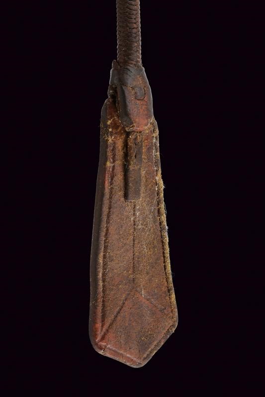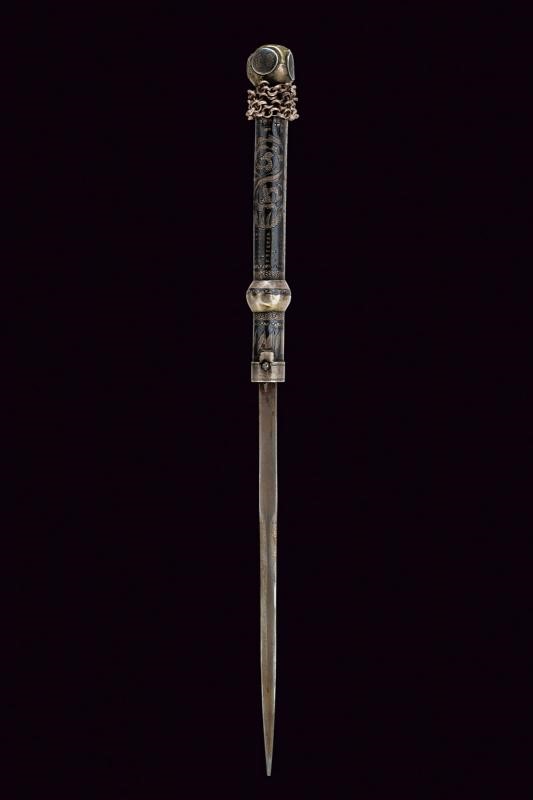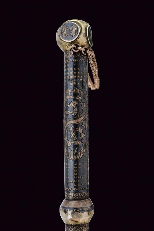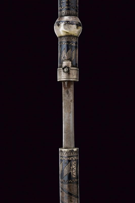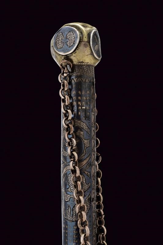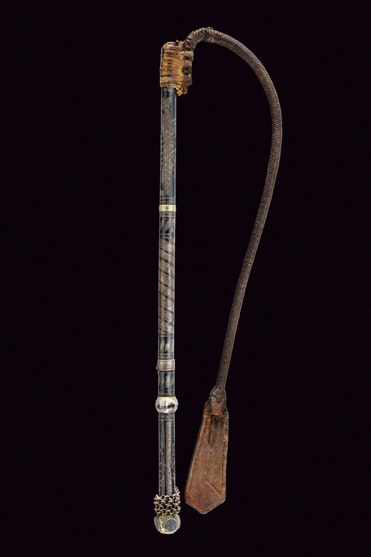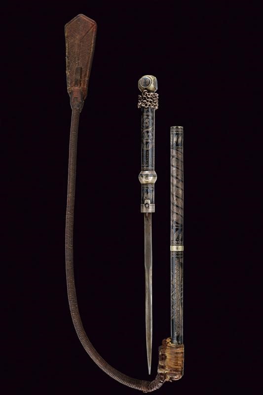 Double-edged blade ribbed at the center and with long, flat tang. Cylindrical handle covered with silver foil, engraved and nieloed with symbols (and writings) and geometrical motifs. handle with two spheres at the edges. Chain and opening button. Cylindrical scabbard decorated en suite. A leather horse whip (restored) is mounted on the chape of the scabbard. Rare.