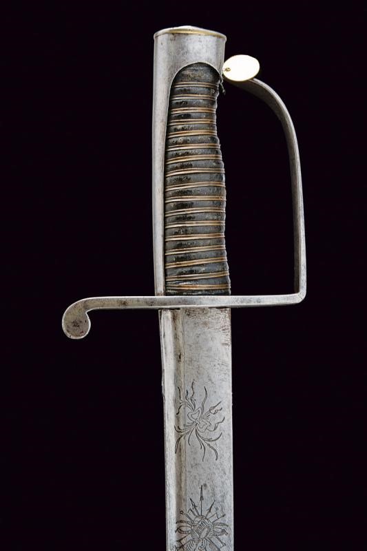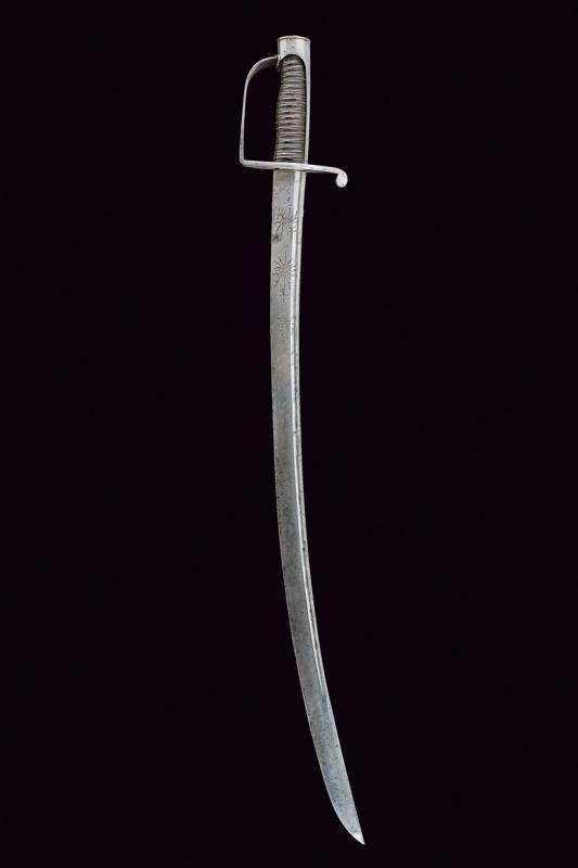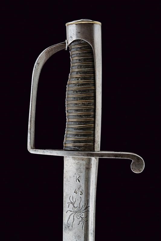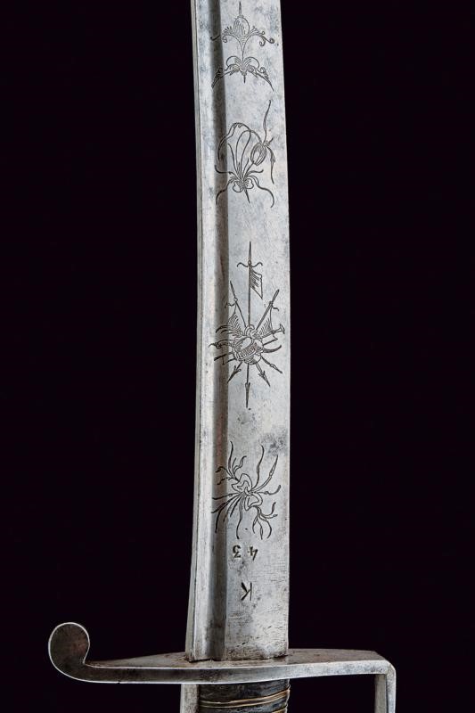 Curved, tipped, single-and short false-edged blade, with fuller near the back, engraved with small trophies and racemes and two deeply marked 'K' and '43' markings at the forte. Iron hilt with stirrup guard. Leather-covered grip with copper wire binding. Smooth cap. Without scabbard.