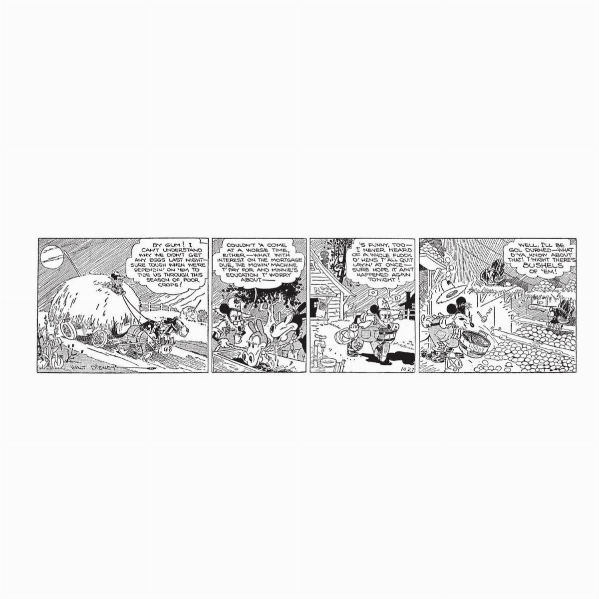 Daily comic strip from 10/27/1930 for "Mickey Mouse". The one we presented is the second oldest Mickey Mouse strip ever to appear on the market, it belongs to the third narrative arc entitled "Mr. Slicker and the Egg Robbers" (translated into Italian "Topolino e il bel gagà") and the first one that saw Gottfredson both to the drawings and to the texts. The protagonist of this historic daily is Marcus Mouse, Minnie's father, disconsolate and driving a hay cart while worrying about his family's finances due to the apparent scarcity of eggs laid by his hens. The rural setting (typical of the very first years of the series) is of great charm, the future Topolinia is made up of a few country houses and the atmosphere is constantly in the balance between childhood moments like Silly Synphonies, such as when Mickey Mouse plays with the farm animals , and neorealist scenes where all the daily problems of the Great Depression appear. A museum artwork. Pin holes in the upper corners, the strip has been rolled up and is therefore slightly arched. Signed Walt Disney and dated.