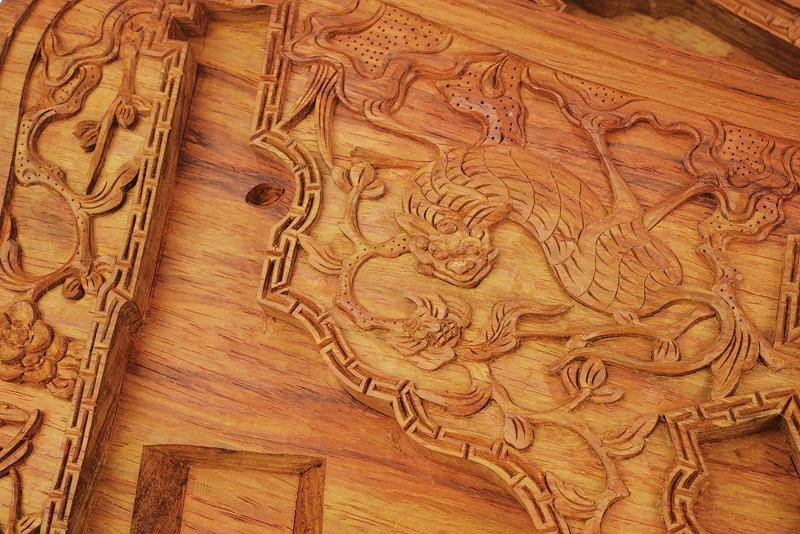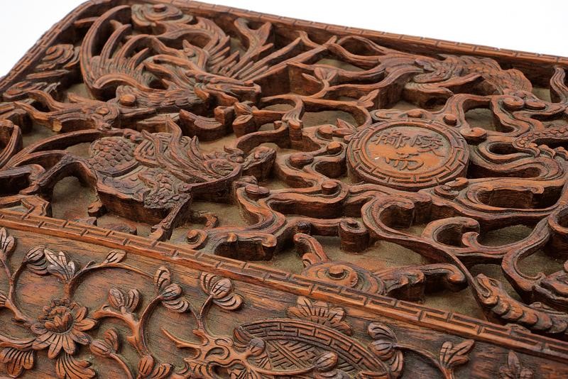 A remarkable cabinet-making work, carved from one single piece. Lid with a round shield at the center, featuring a short Chinese inscription, surrounded by various creatures including a dragon, the Fenghuang, a Qilin and a dragon-turtle. Oblique border wo