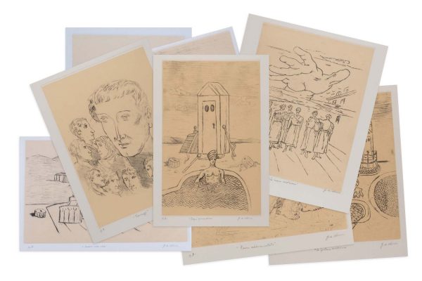 Interessantissimi, anche se diversi tra loro, i due lotti successivi: l’omaggio a Leonardo da Vinci del maestro della Transavanguardia Sandro Chia (lotto 28, € 1.000-1.500) e il Senza Titolo, 1972, del compositore e poeta visivo Giuseppe Chiari, sette fotolitografie a tema musicale tra cui Non c’è musica più bella di quella che sto ascoltando ora (lotto 29, € 200-400). Lotto di più fogli anche il 44, ben dieci tavole di Giorgio De Chirico, summa iconografica del maestro romano (€ 6.000-8.000). Ai lotti 64 e 65 due opere di Lucio Fontana  un Concetto Spaziale del 1956, acquaforte in cui l’artista sembra riunificare l’idea dei tagli  e delle madri natura (€ 800-1.000)  e un multiplo in pvc rosa, riproduzione del gesto dei famosi tagli, accompagnato dalla pubblicazione con fotografie di Ugo Mulas, il tutto Edizioni Achille Mauri (€ 3.000-4.000).  Soggetto del lotto 82 di Emilio Isgrò è il Cricket, le parole, usuale materia prima dell’artista, si miscelano qui con delle pietre una serigrafia dai toni delicati (€ 150-200).