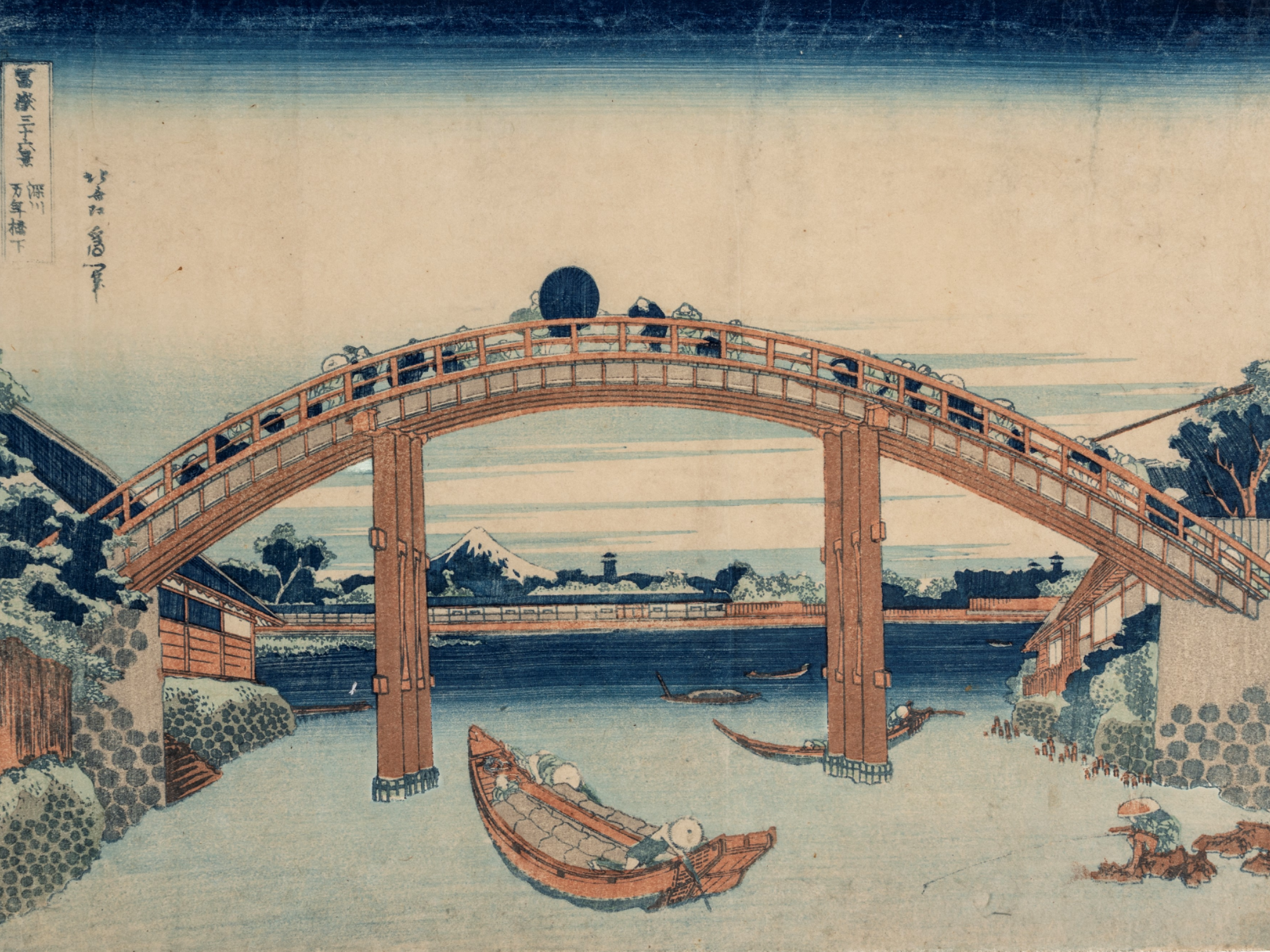 Sotto il Ponte Mannen a Fukagawa (ca. 1830–31) – Lotto 135. La sesta veduta della serie sceglie un’inquadratura quasi fotografica, frontale e ribassata: il ponte Mannen occupa il centro della composizione con la sua arcata robusta, sostenuta da pilastri di tronchi legati da grosse funi. Sul parapetto la folla si affaccia, da un lato verso le imbarcazioni e il pescatore solitario sugli scogli, dall’altro verso il Fuji innevato all’orizzonte. Il ponte connette i quartieri di Fukagawa e Fukagawa Kiyomizu, separati dal fiume Onaki; oltre il ponte scorre il Sumida, dietro cui si apriva il quartiere dei piaceri di Nakasu. La monumentalità architettonica e la vitalità della scena urbana mostrano la sperimentalità di Hokusai, e le soluzioni prospettiche che anticipano la fotografia di decenni.