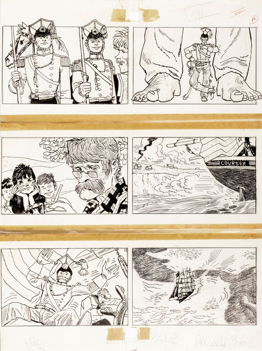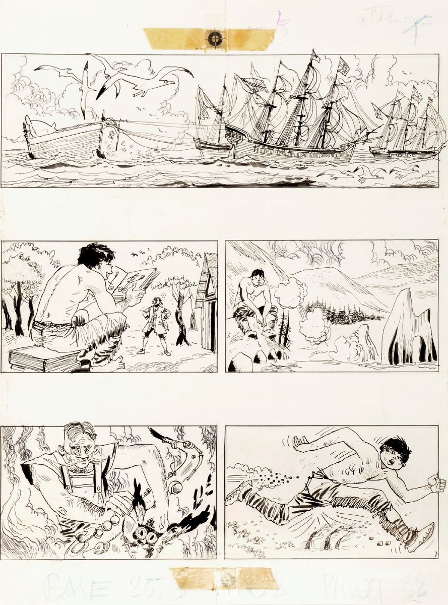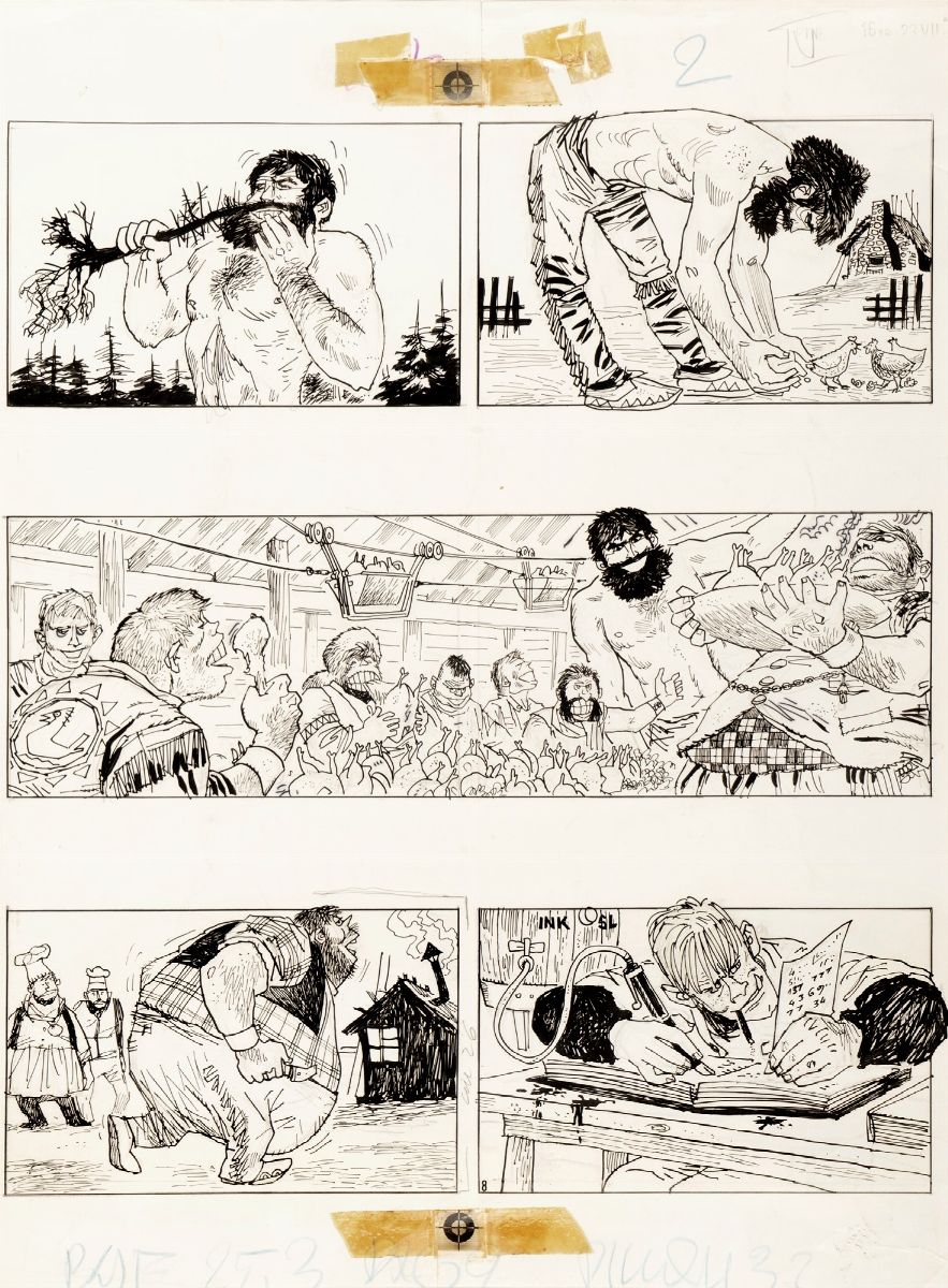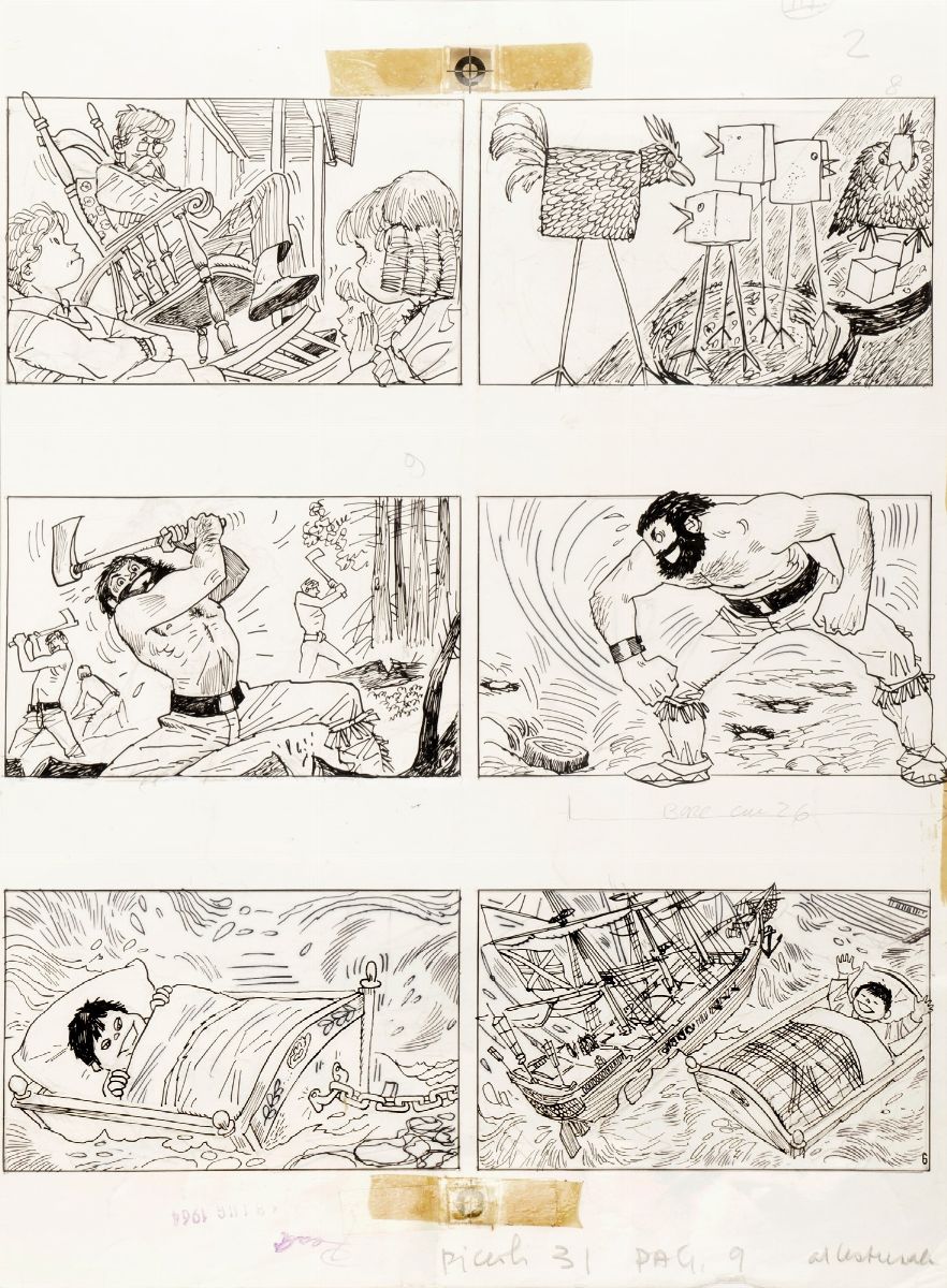Tavole originali realizzate da Pratt per “Il favoloso West: I giganti burloni”, pag. 6 - 7 -8 - 15 di questa ballata folk pubblicata per la prima volta sul Corriere dei Piccoli n. 31 nel 1964. Colorate al retro a tempera.