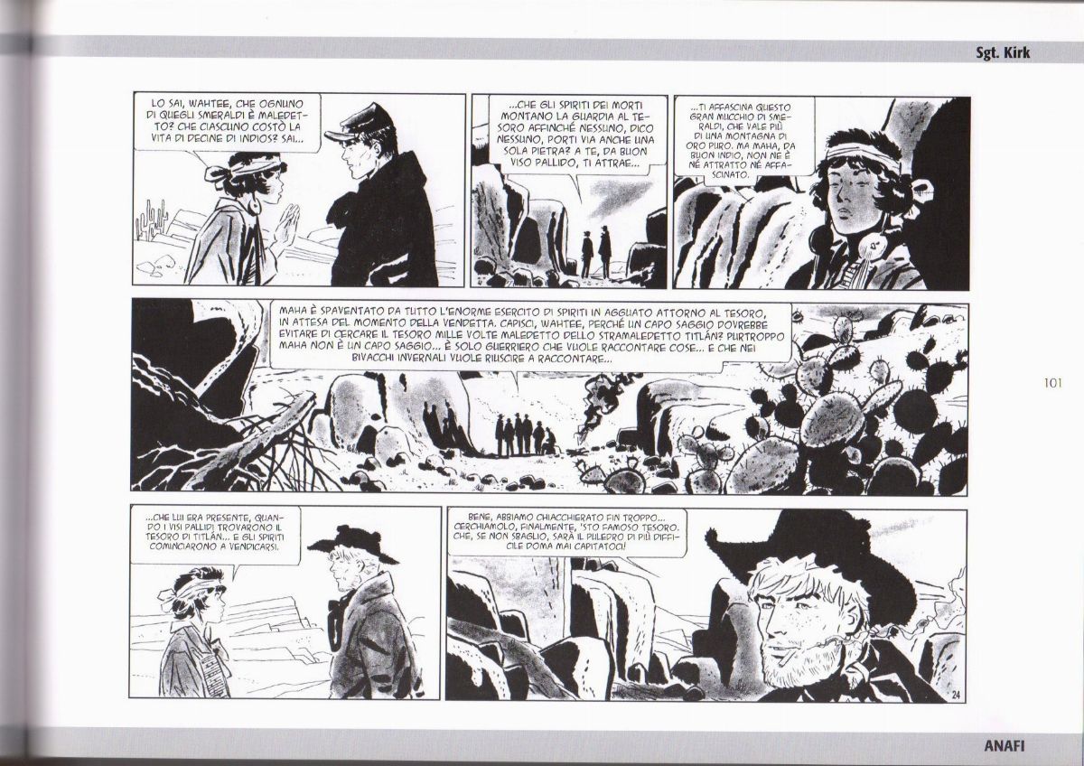 Tavola originale realizzata da Pratt per "Il castello di Titlàn", pag. 24 dell’ultima avventura de Il Sergente Kirk pubblicata per la prima volta in Argentina su Hora Cero Suplemento Semanal n. 71 dall’Editorial Frontera nel Gennaio 1959, ristampata in Italia nel volume "Il Sergente Kirk" dalla ANAFI nel 2008. Lievi pieghe e un piccolo strappo al margine inferiore.