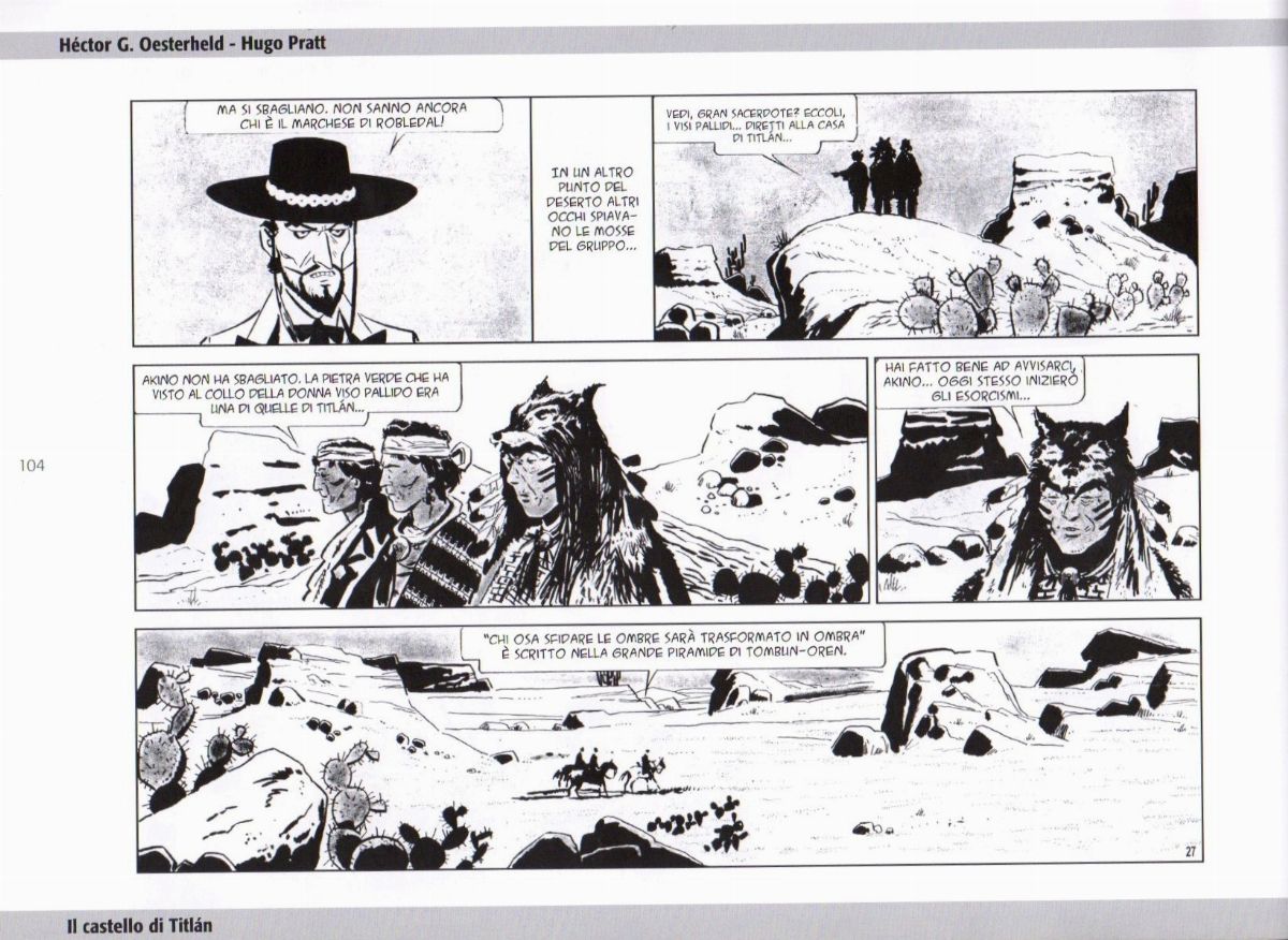Tavola originale realizzata da Pratt per "Il castello di Titlàn", pag. 27 dell’ultima avventura de Il Sergente Kirk pubblicata per la prima volta in Argentina su Hora Cero Suplemento Semanal n. 72 dall’Editorial Frontera nel Gennaio 1959, ristampata in Italia nel volume "Il Sergente Kirk" dalla ANAFI nel 2008. Lievi pieghe, piccola mancanza all'angolo inferiore destro e strappi estesi al margine inferiore.