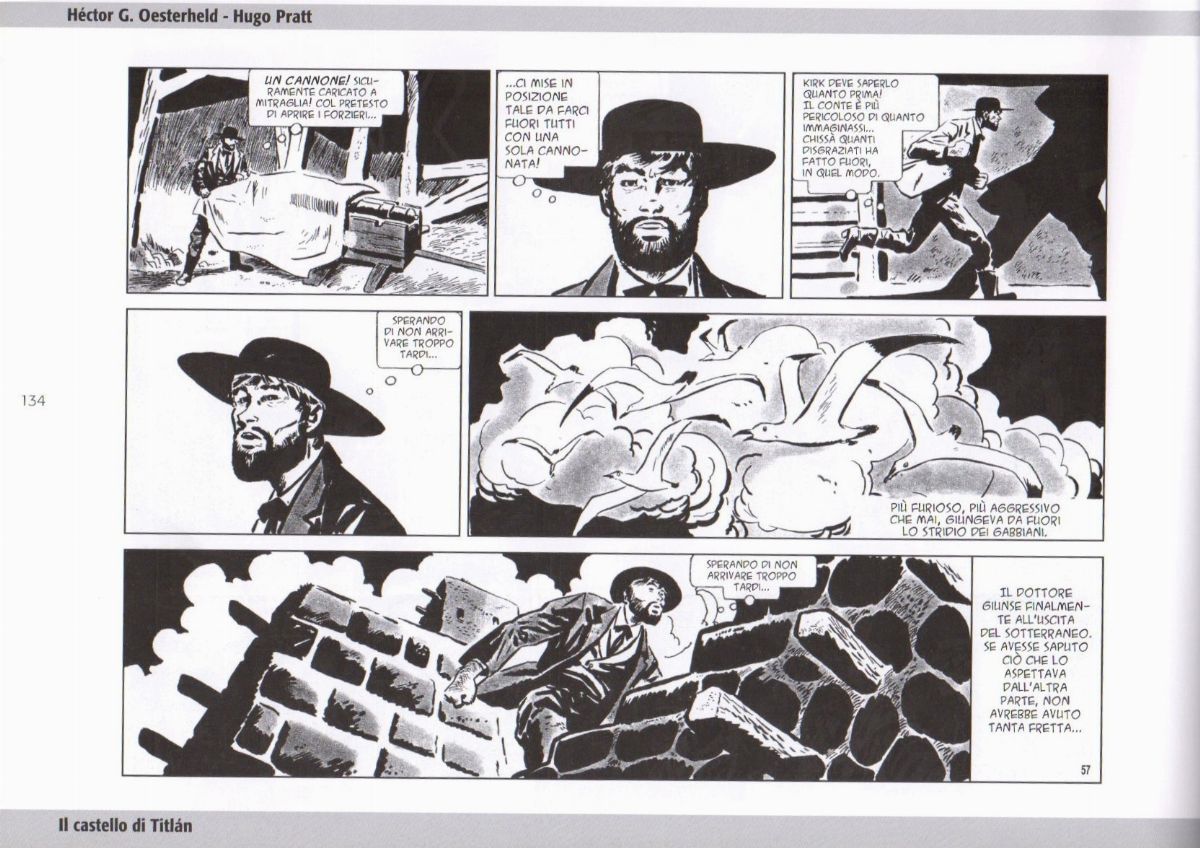 Tavola originale realizzata da Pratt per "Il castello di Titlàn", pag. 57 dell’ultima avventura de Il Sergente Kirk pubblicata per la prima volta in Argentina su Hora Cero Suplemento Semanal n. 82 dall’Editorial Frontera nel Marzo 1959, ristampata in Italia nel volume "Il Sergente Kirk" dalla ANAFI nel 2008. Lievi pieghe.