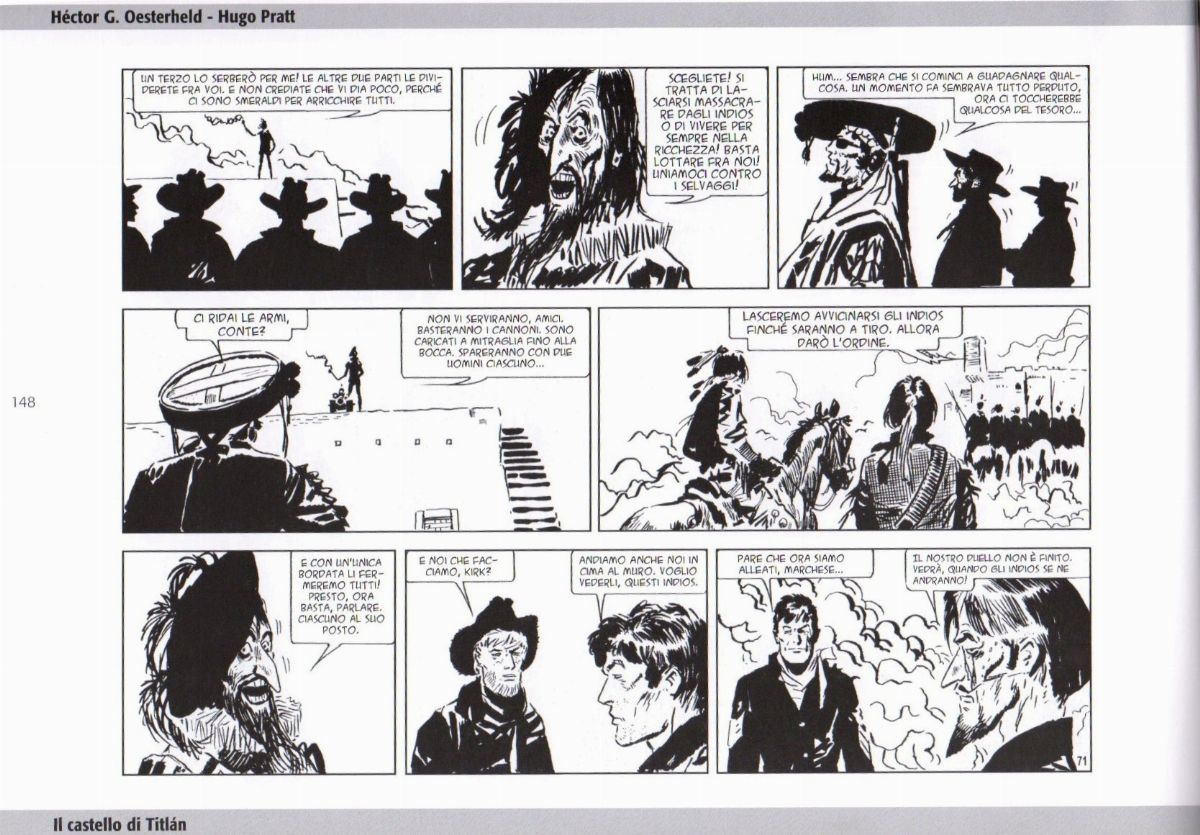 Tavola originale realizzata da Pratt per "Il castello di Titlàn", pag. 71 dell’ultima avventura de Il Sergente Kirk pubblicata per la prima volta in Argentina su Hora Cero Suplemento Semanal n. 87 dall’Editorial Frontera nell'Aprile 1959, ristampata in Italia nel volume "Il Sergente Kirk" dalla ANAFI nel 2008. Lievi pieghe.