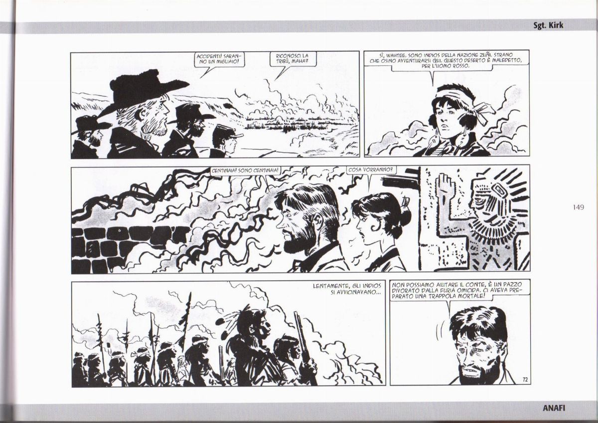 Tavola originale realizzata da Pratt per "Il castello di Titlàn", pag. 72 dell’ultima avventura de Il Sergente Kirk pubblicata per la prima volta in Argentina su Hora Cero Suplemento Semanal n. 87 dall’Editorial Frontera nell'Aprile 1959, ristampata in Italia nel volume "Il Sergente Kirk" dalla ANAFI nel 2008. Lievi pieghe.