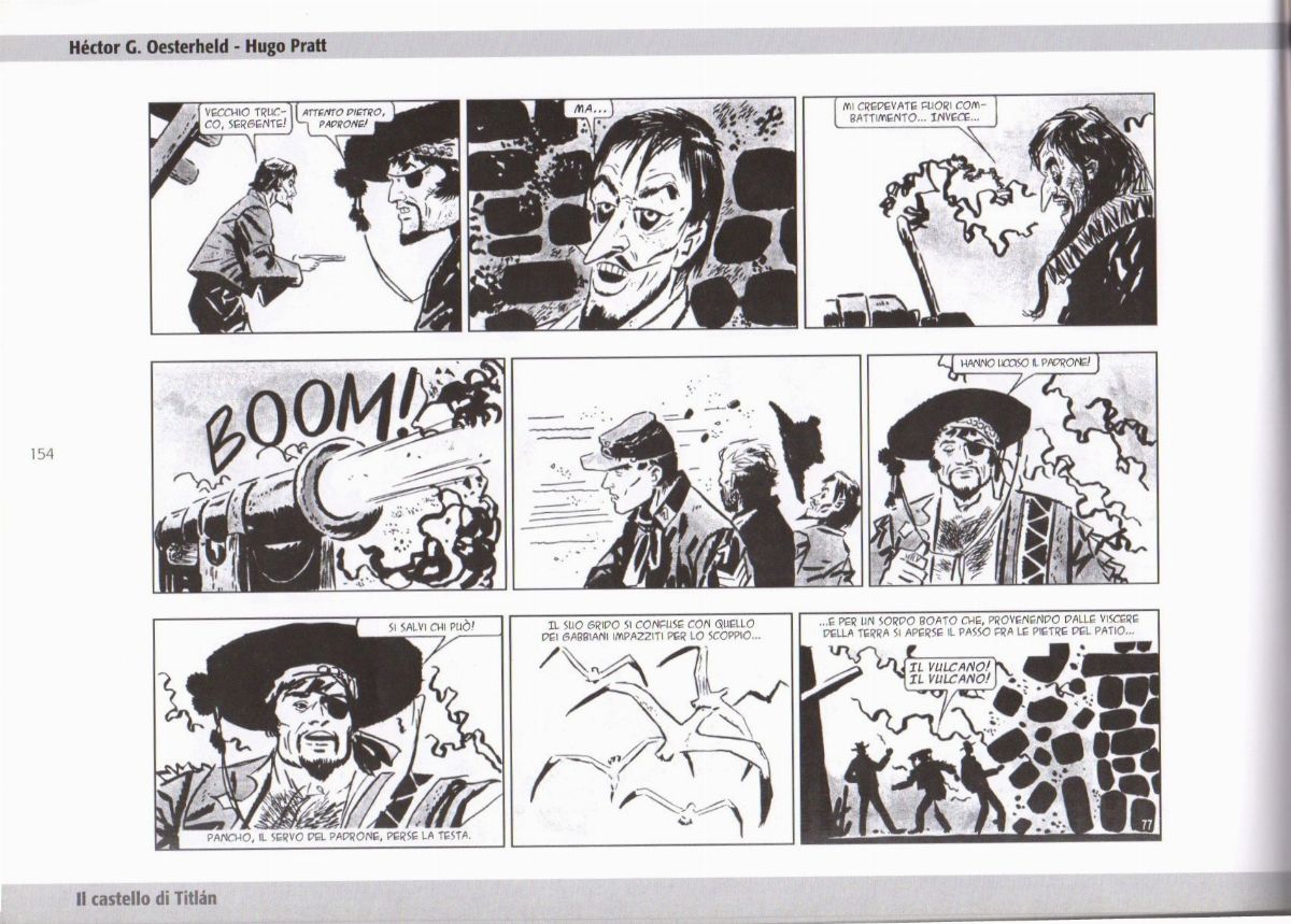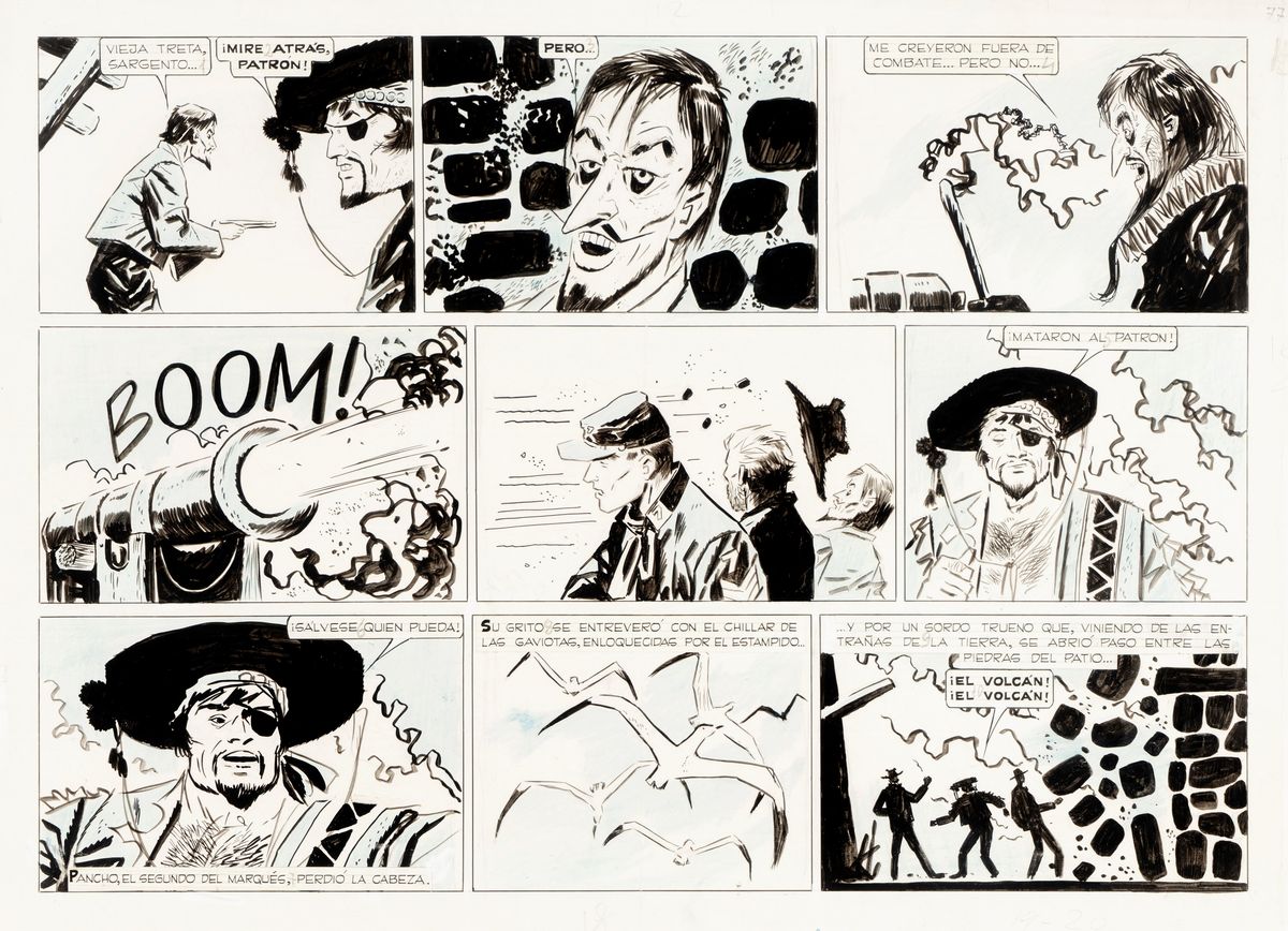 Tavola originale realizzata da Pratt per "Il castello di Titlàn", pag. 77 dell’ultima avventura de Il Sergente Kirk pubblicata per la prima volta in Argentina su Hora Cero Suplemento Semanal n. 89 dall’Editorial Frontera nel Maggio 1959, ristampata in Italia nel volume "Il Sergente Kirk" dalla ANAFI nel 2008. Al retro una serie di autoritratti di Pratt insieme alla sua collaboratrice dell'epoca Gisela Dester. Lievi pieghe e lieve piega verticale al centro.