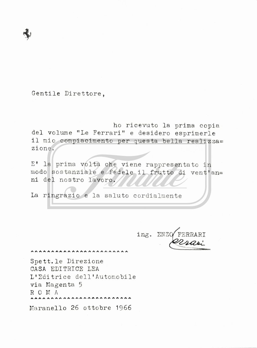 Libro "Le Ferrari" di Gianni Rogliatti/Emilio Ferraboschi, con cistodia e lettera autografa da Enzo Ferrari