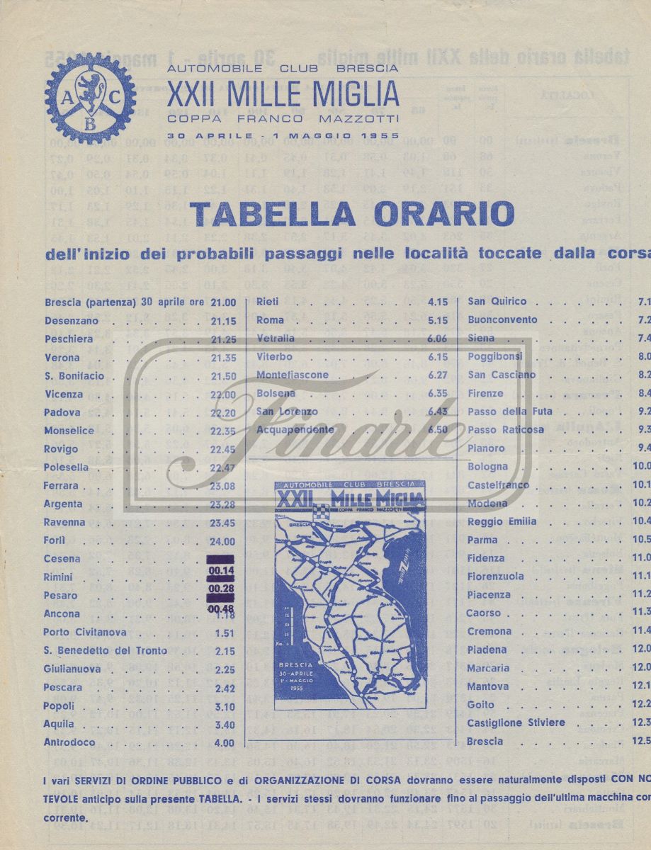 - Regolamento di gara (12 pagine italiano - 22 cm x 30 cm);- Tabella orario dell'inizio dei probabili passaggi nelle località toccate dalla corsa (2 pagine italiano - 22 cm x 29 cm);