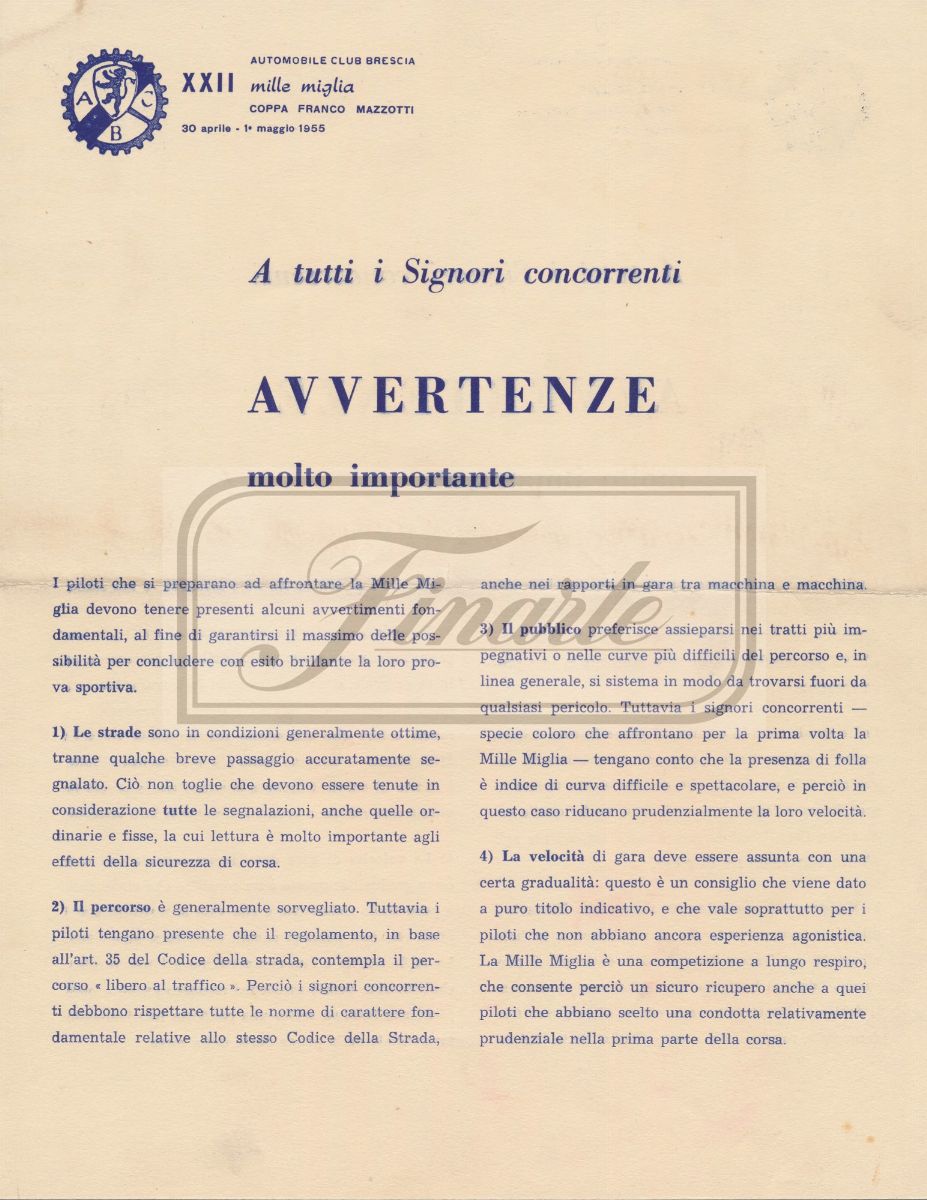 - Comunicazione a tutti i signori concorrenti avvertenze molto importanti (2 pagine italiano - 22 cm X 28 cm).