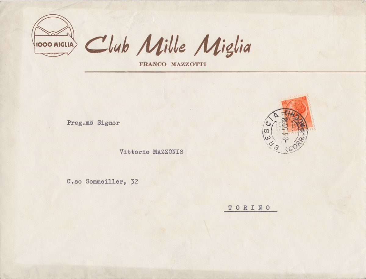 - Busta affrancata su carta intestata Club Mille Miglia del 08/04/1959 (24 cm x 19 cm);