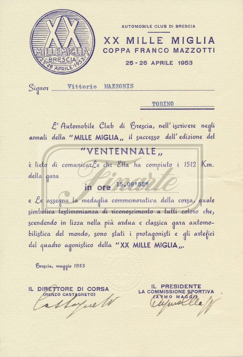 - Lettera su carta intestata XXI Mille Miglia del 1953 di assegnazione al pilota della medaglia commemorativa, autografata da Renzo Castagneto e Aymo Maggi (italiano - 15 cm x 22 cm).