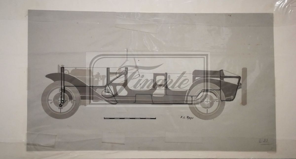 N°2 disegni a mano di Fabio Luigi Rapi per le pubbliczioni dell'Editrice dell'Automobile. Sul fronte la Lancia Aprilia Aerodinamica, sul retro lo schema del telaio della Lancia lambda