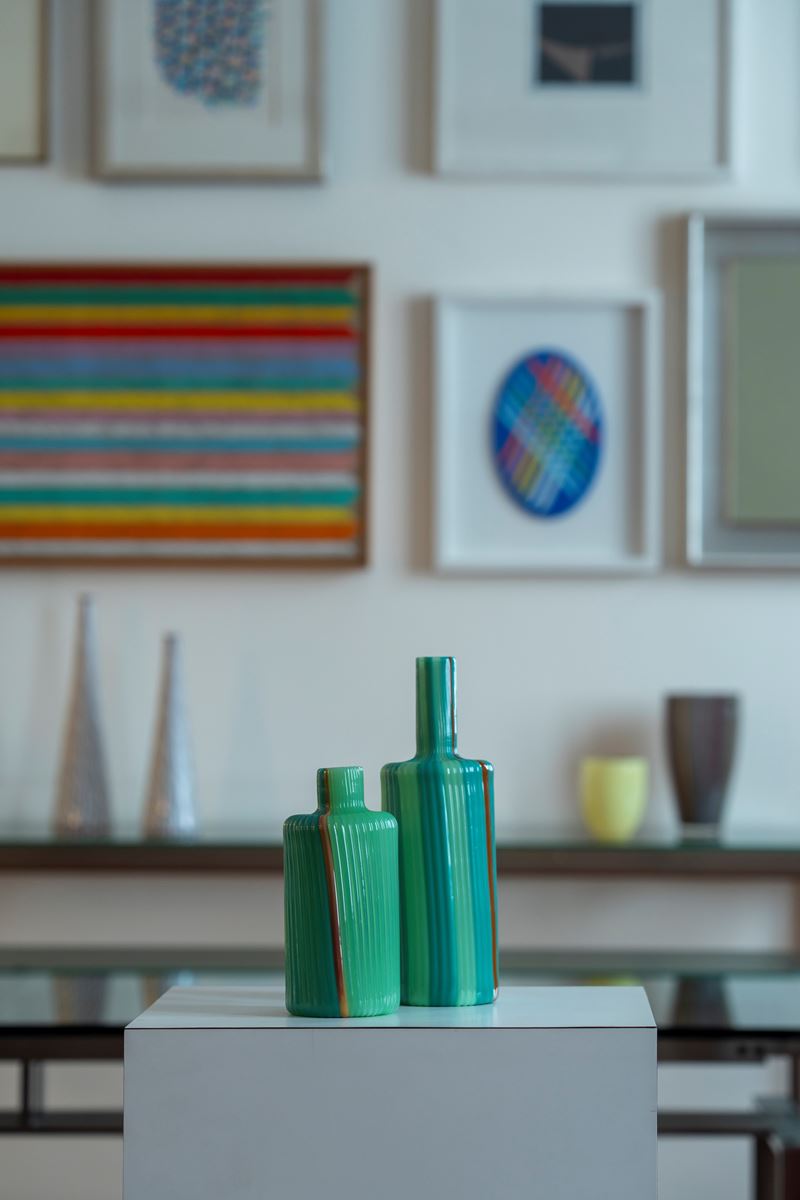 Coppia di bottiglie in vetro soffiato con decoro a canne policrome