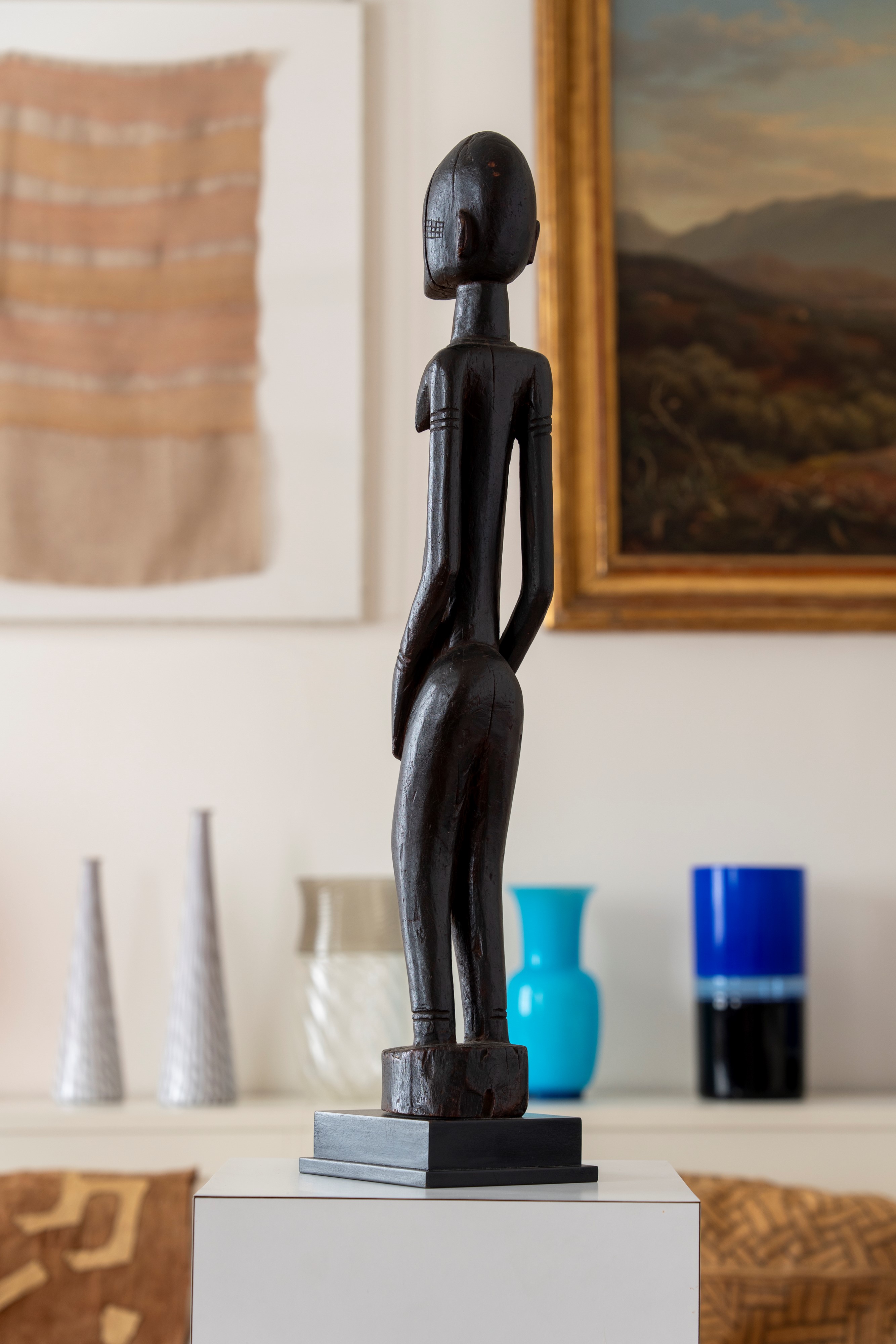 Rappresentazione della statuaria classica Dogon, la figura stilizzata è sostenuta da una grossa base cilindrica e porta al collo un pettorale scolpito in rilievo.