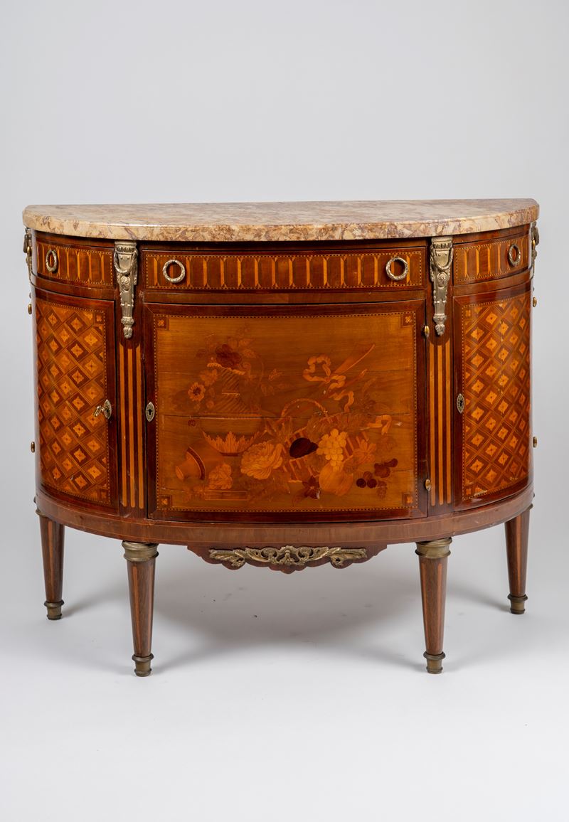 Elegante credenza demi-lune in stile Luigi XVI lastronata, filettata e intarsiata con piano in marmo. Francia, secolo XIX