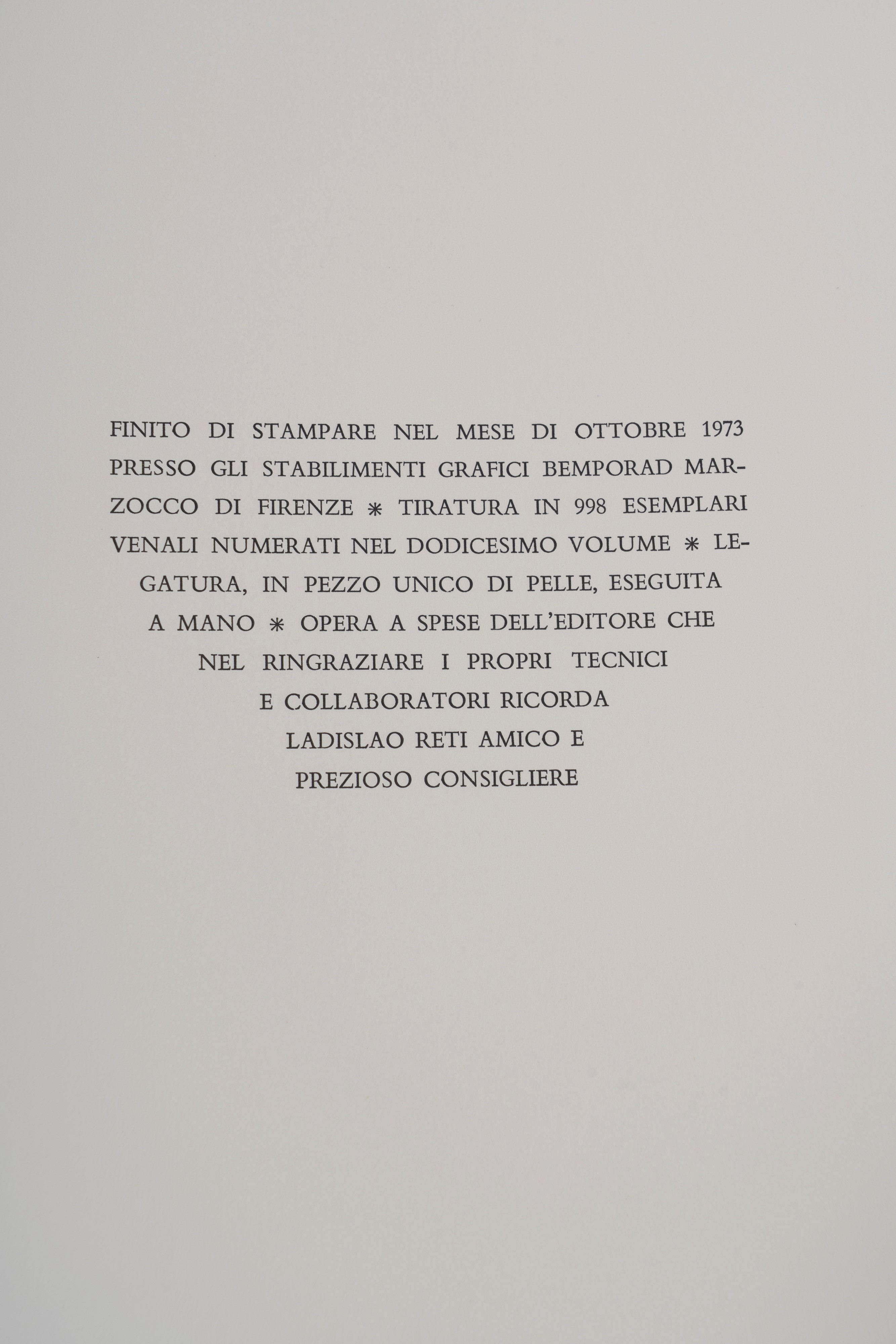 Firenze, Giunti Barbera, 1973-'80. 12 volumi in facsimile, formato 44x65 cm., e 12 volumi di testo formato 22x30 cm. di trascrizione diplomatica e critica a cura di Augusto Marinoni, rilegati a mano in piena pelle, con impressioni in oro sul dorso. Edizione limitata di 998 copie.