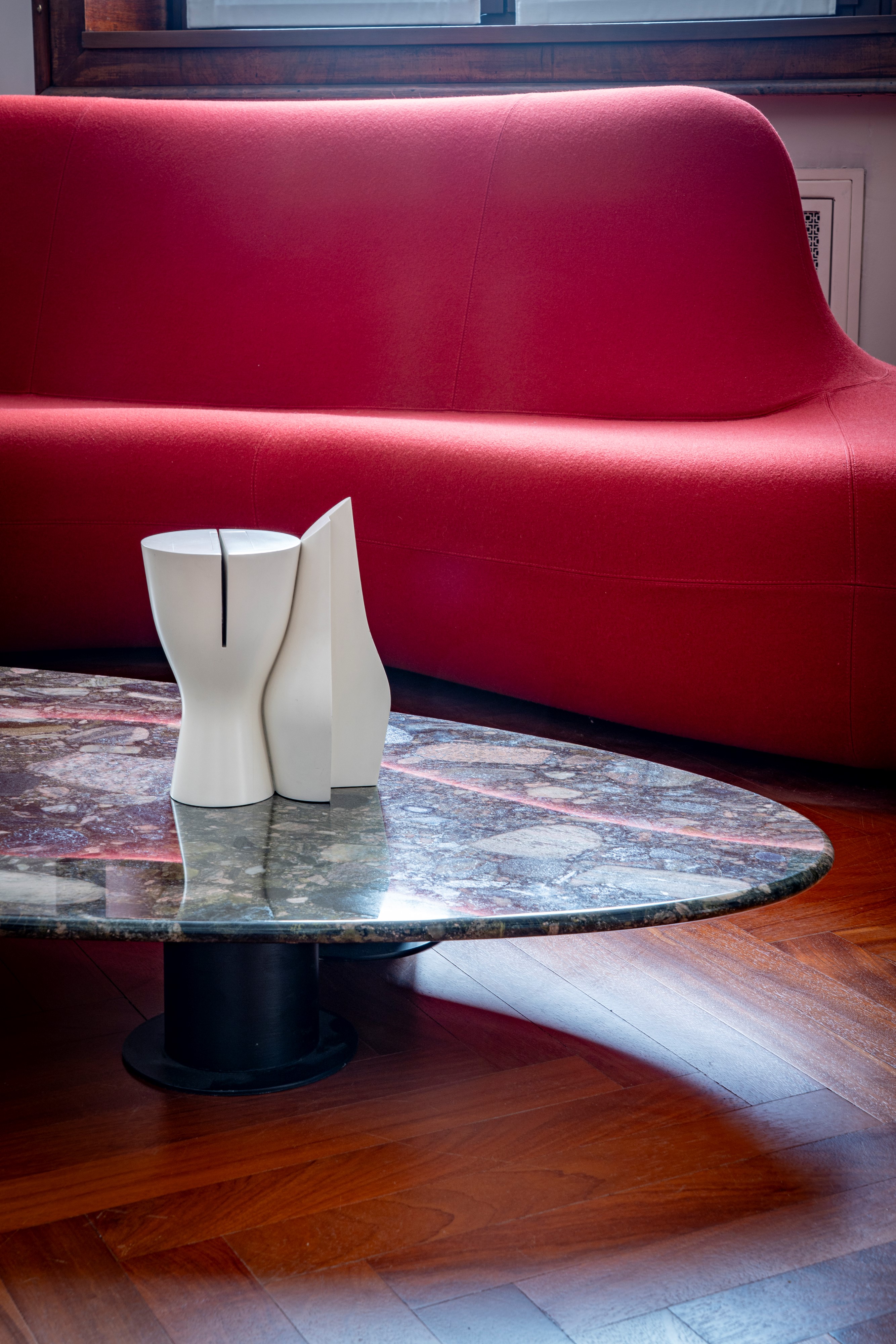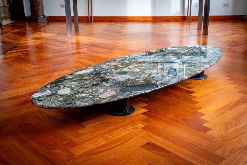 Tavolo basso con piano in granito Verde Marinace e sostegni in metallo verniciato