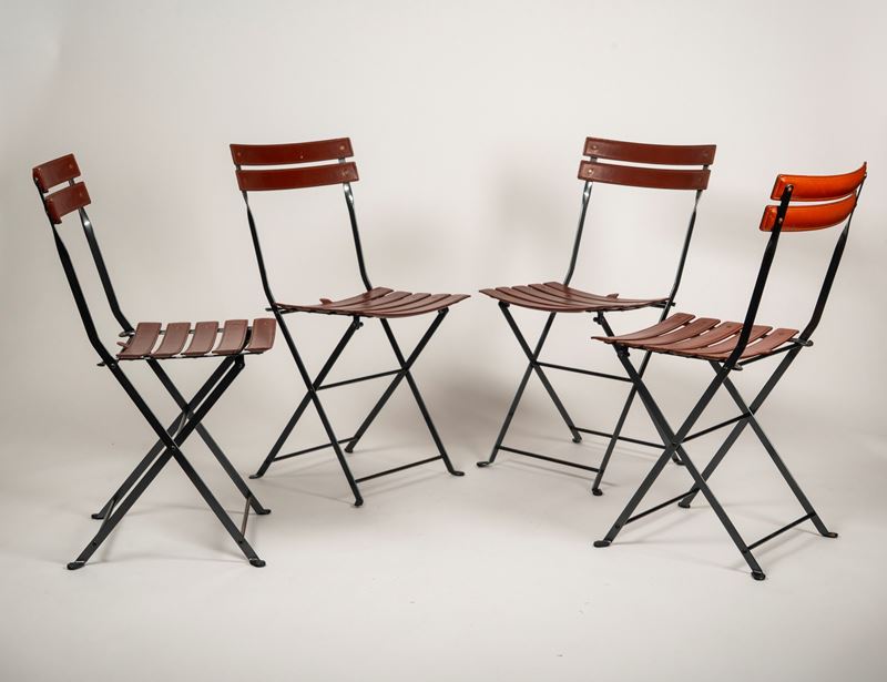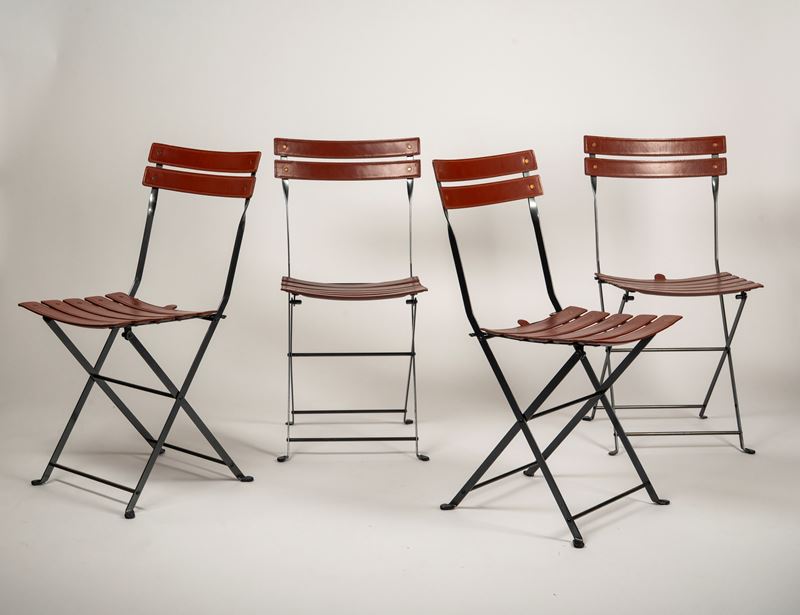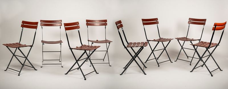 Gruppo di otto sedie pieghevoli modello 'Celestina' con struttura in acciaio, schienale e sedile a doghe rivestite in cuoio marrone
