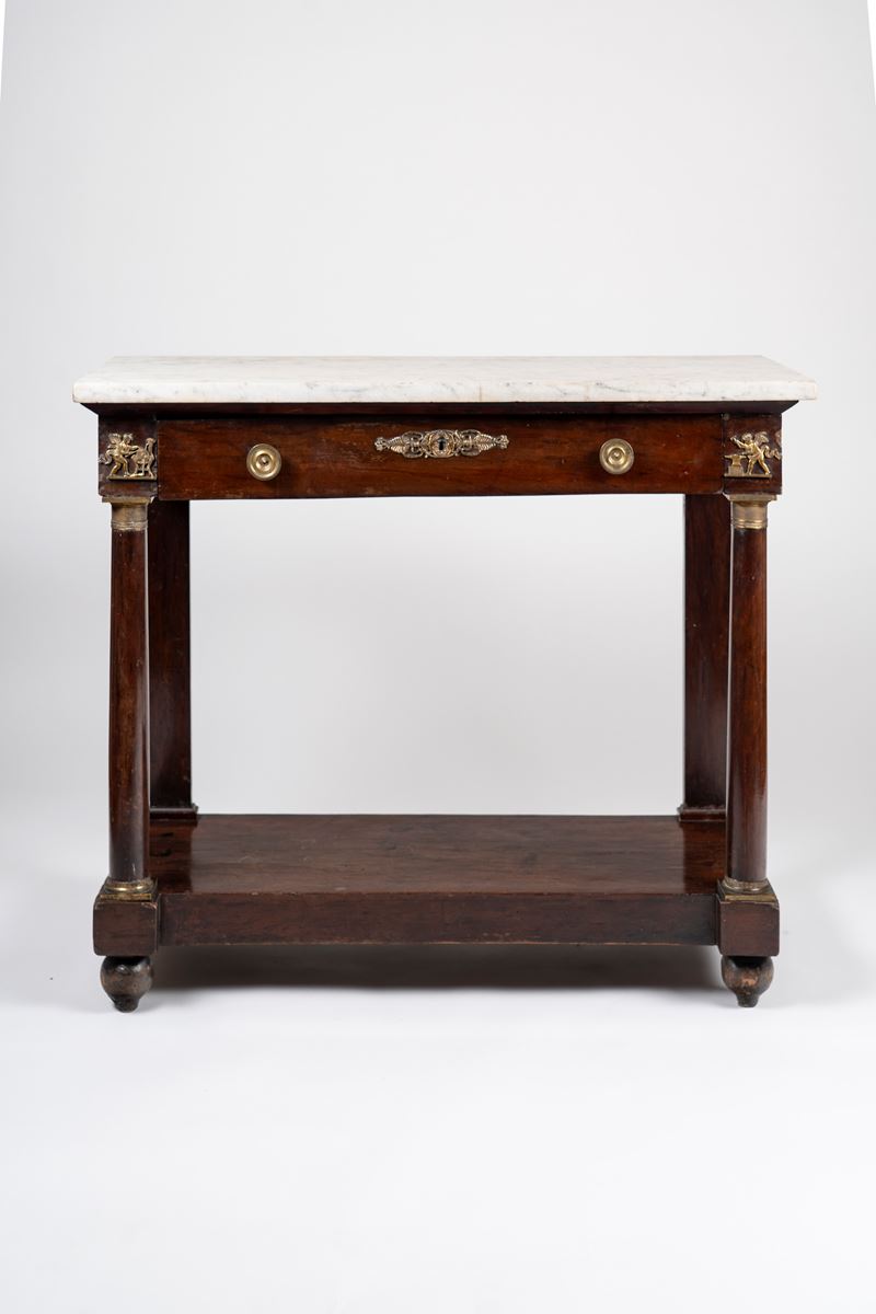 Piccola console Impero lastronata con piano in marmo bianco. Secolo XIX