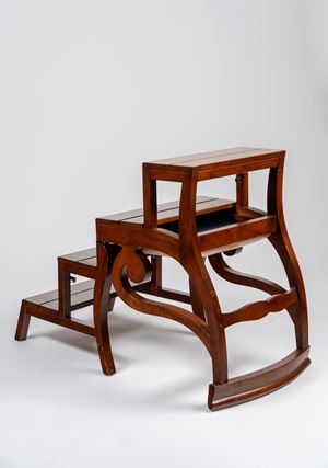 Poltrona con braccioli terminanti a ricciolo convertibile in scaletta da biblioteca in legno intagliato e lastronato.