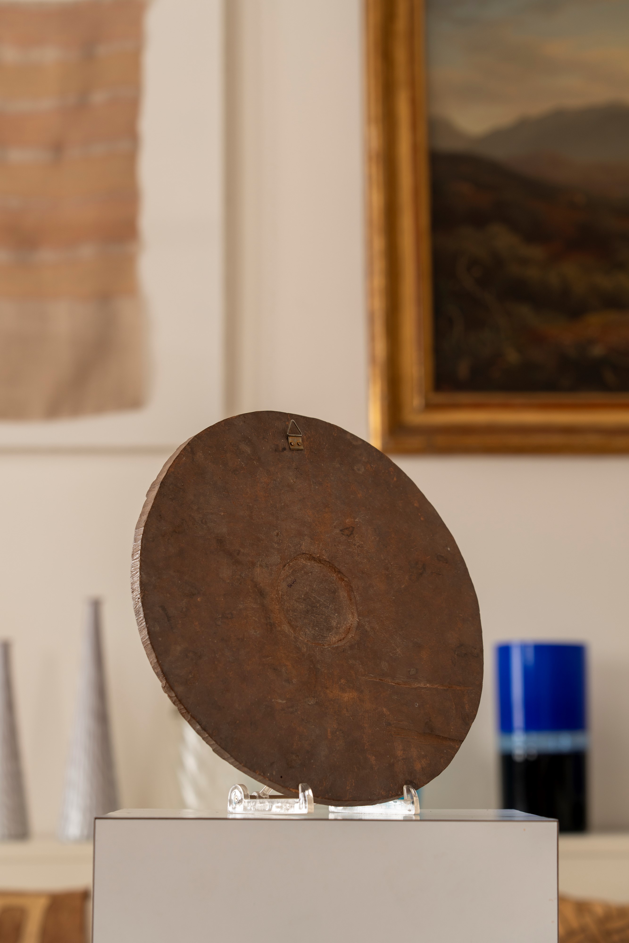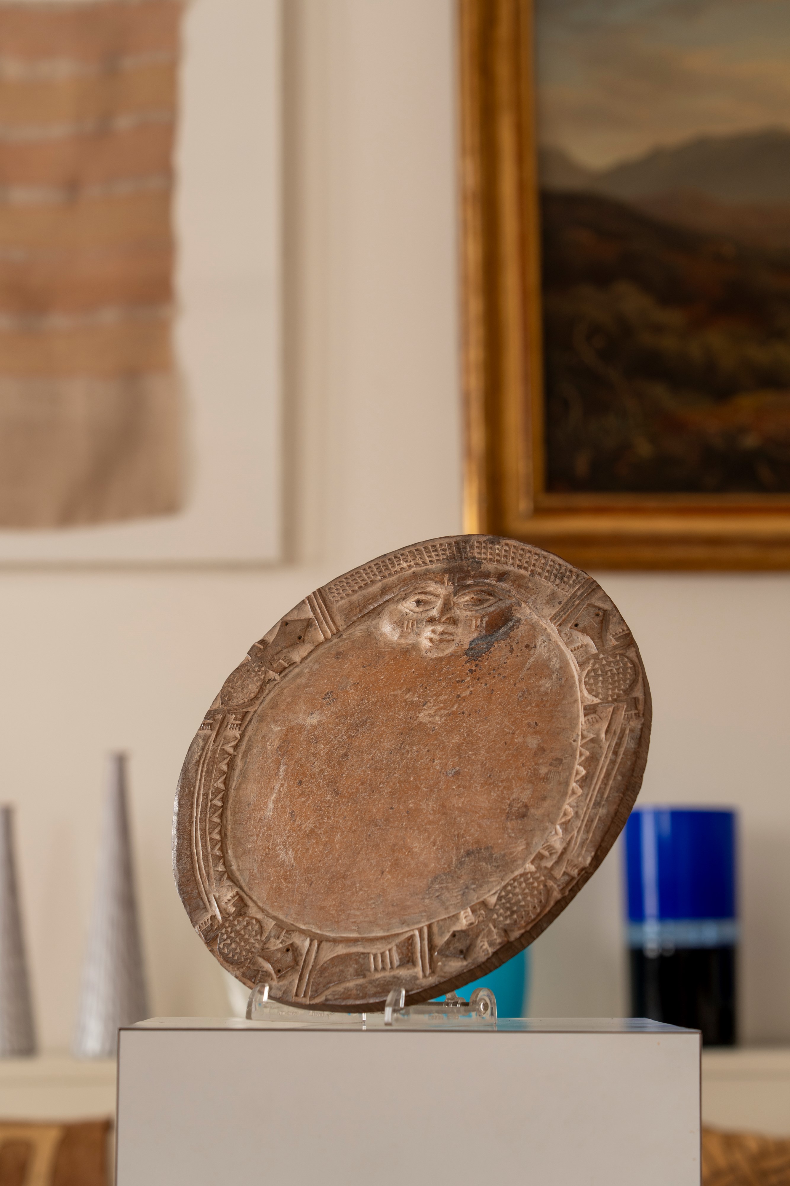 in legno di forma circolare a patina chiara con simboli in rilievo.