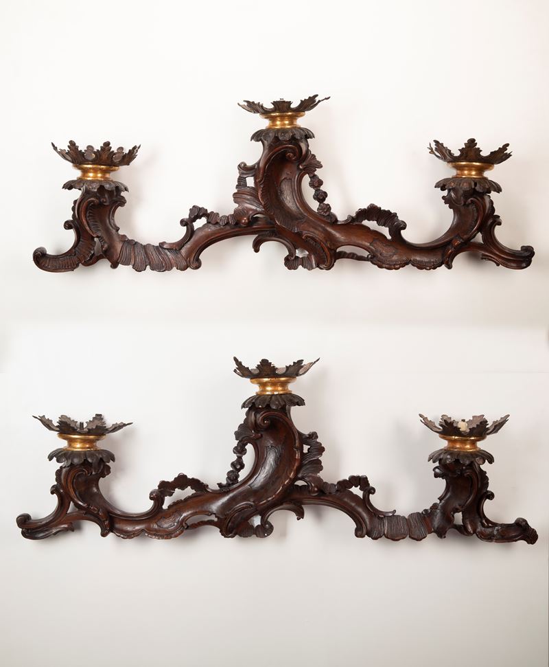 Coppia di candelieri da parete a tre luci in noce intagliato. Venezia, secolo XVIII