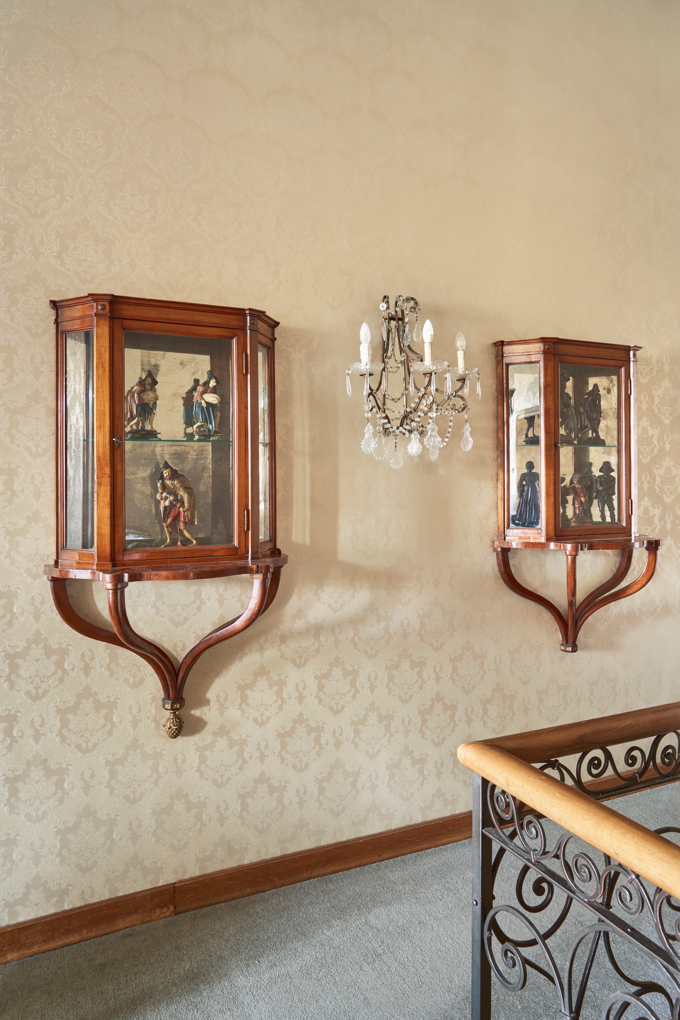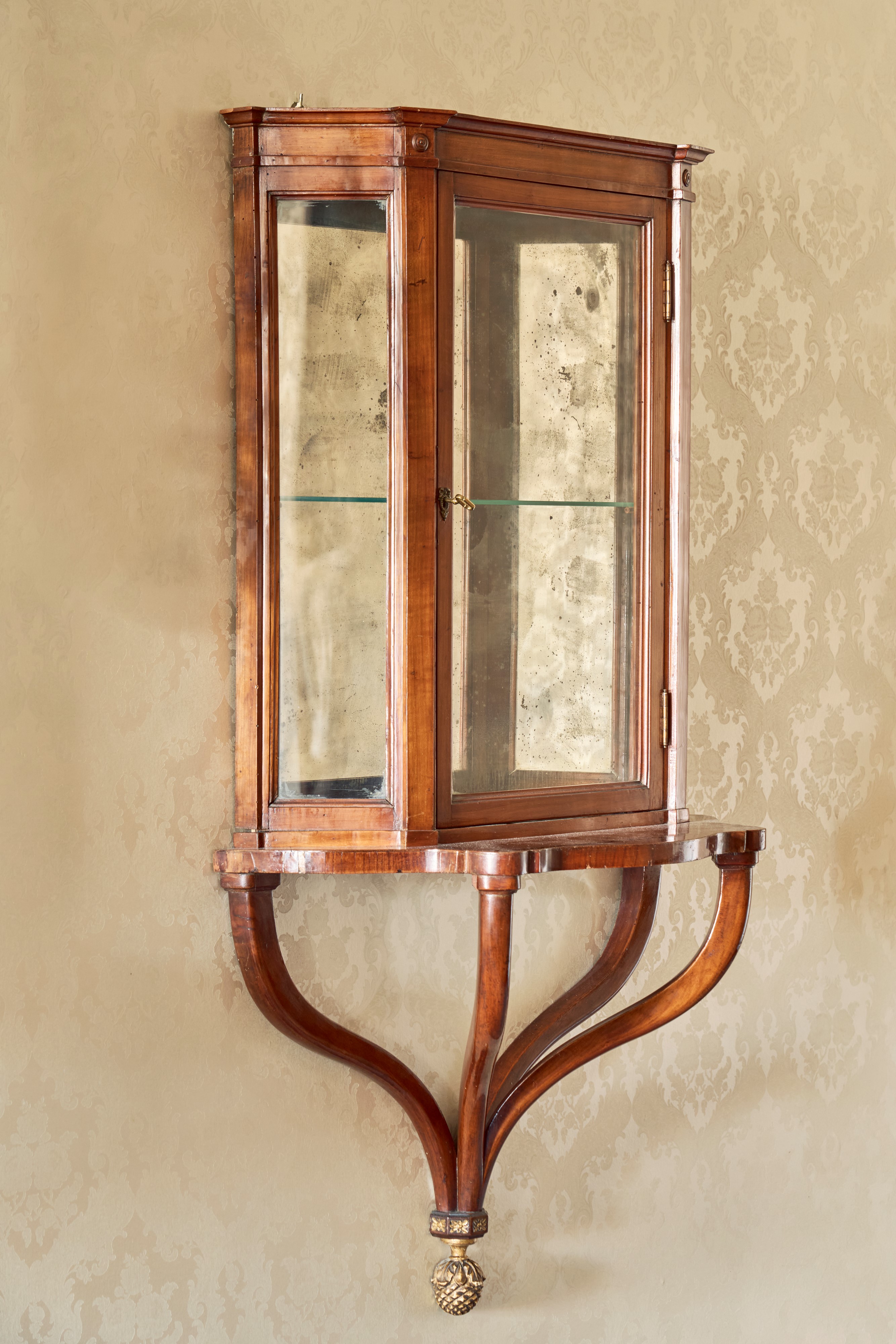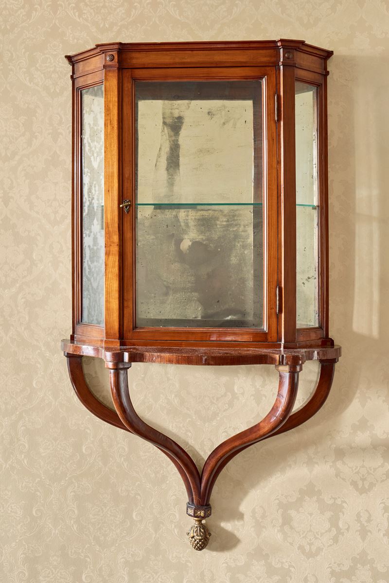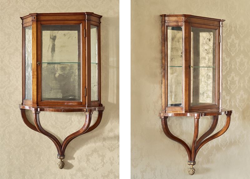 Le consoles lastronate in ciliegio di forma sagomata con sostegni a voluta rastremati uniti da elemento a pigna dorato. Le vetrine scantonate con anta frontale.