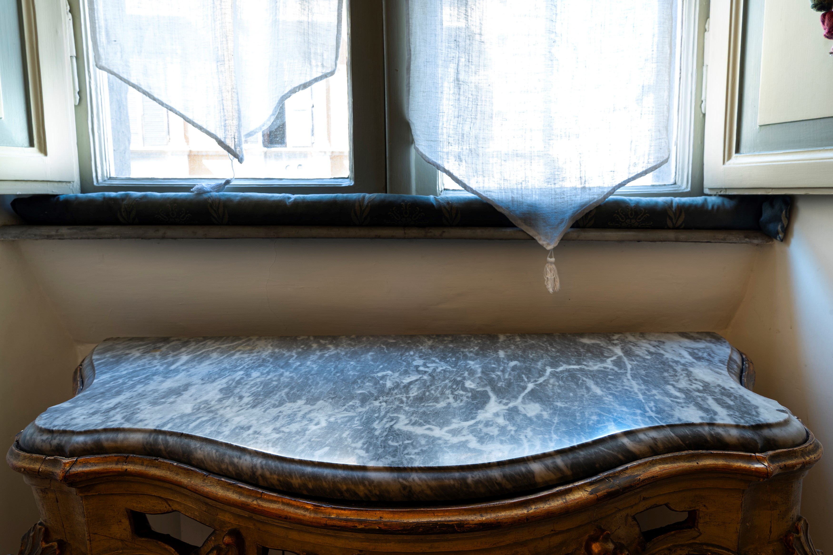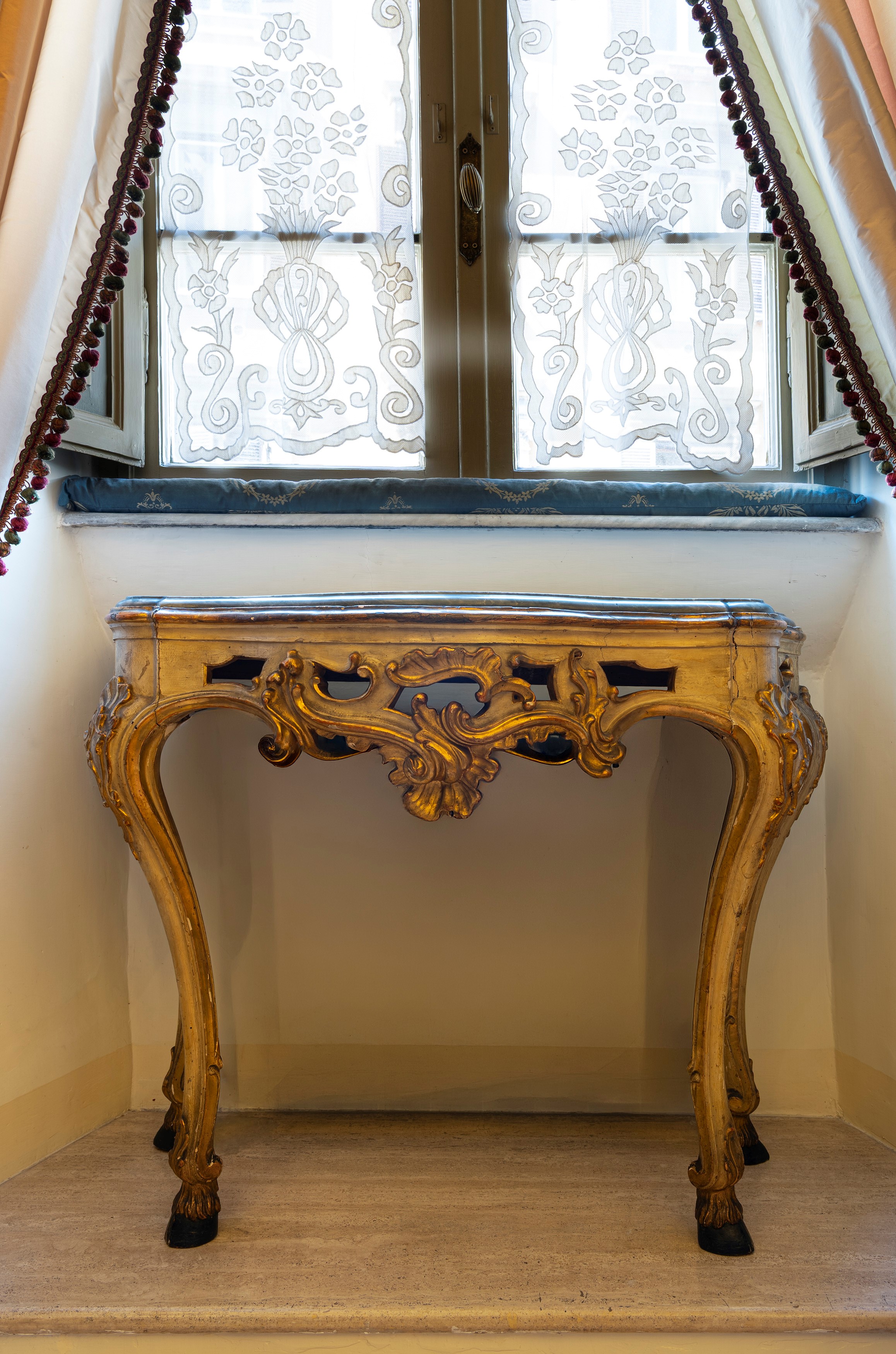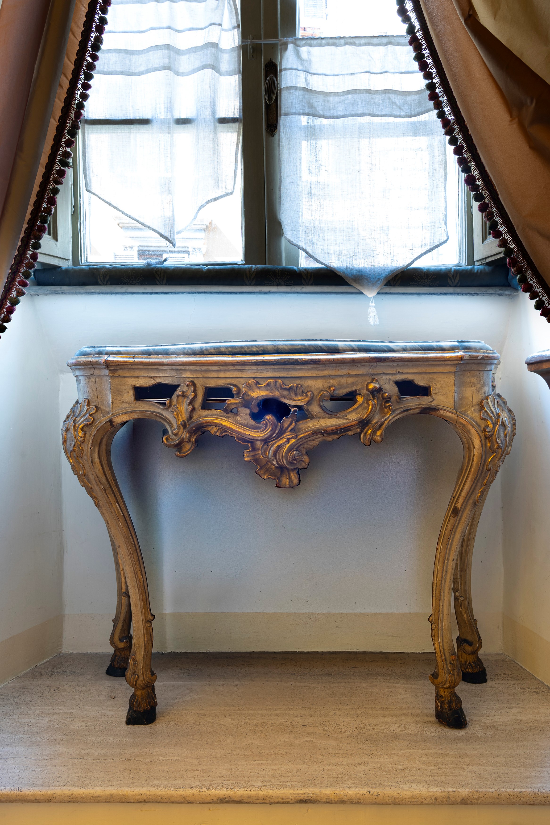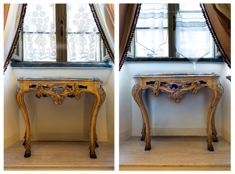 Coppia di consoles in legno intagliato, dipinto e dorato con piano in marmo grigio. Lombardia, secolo XVIII