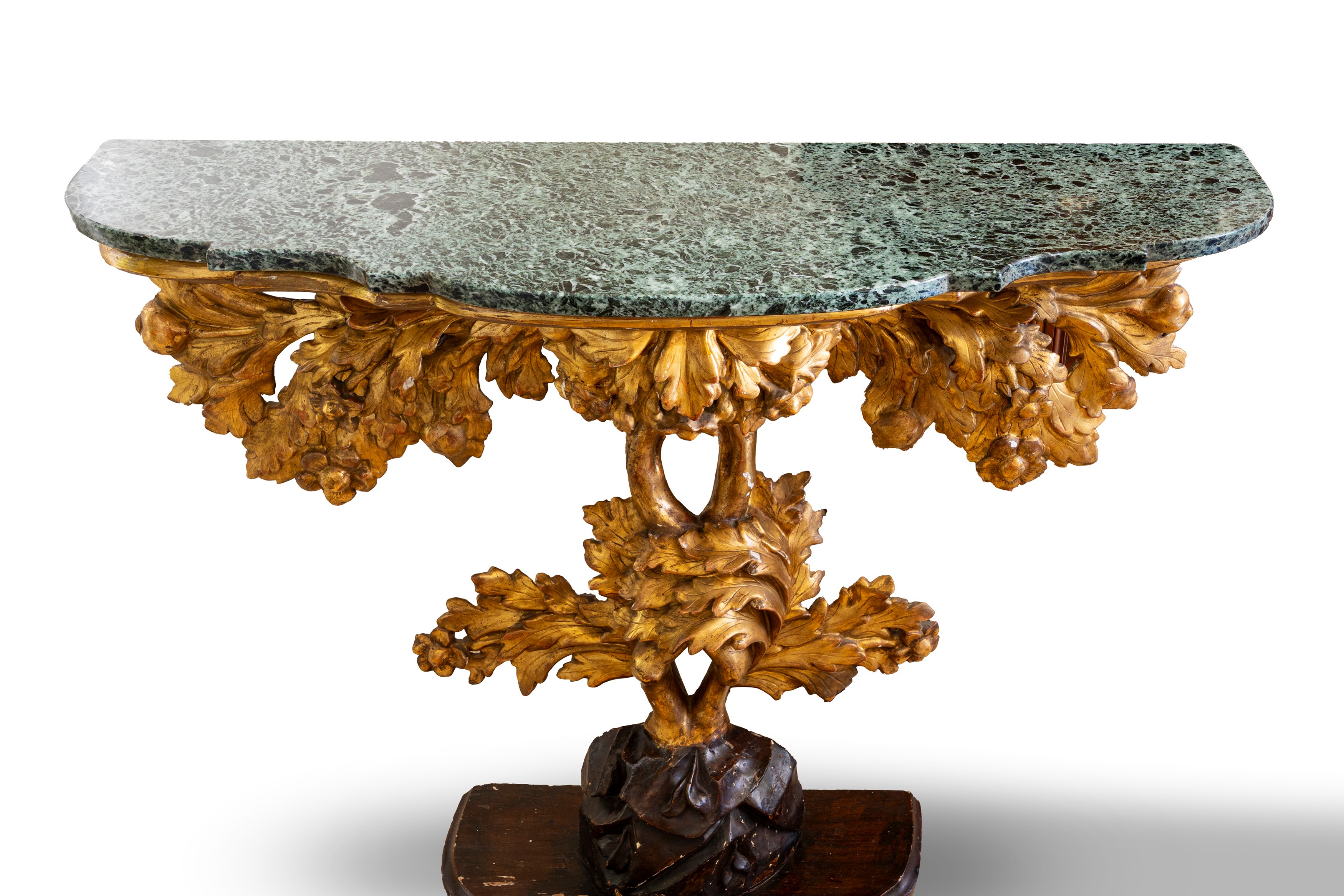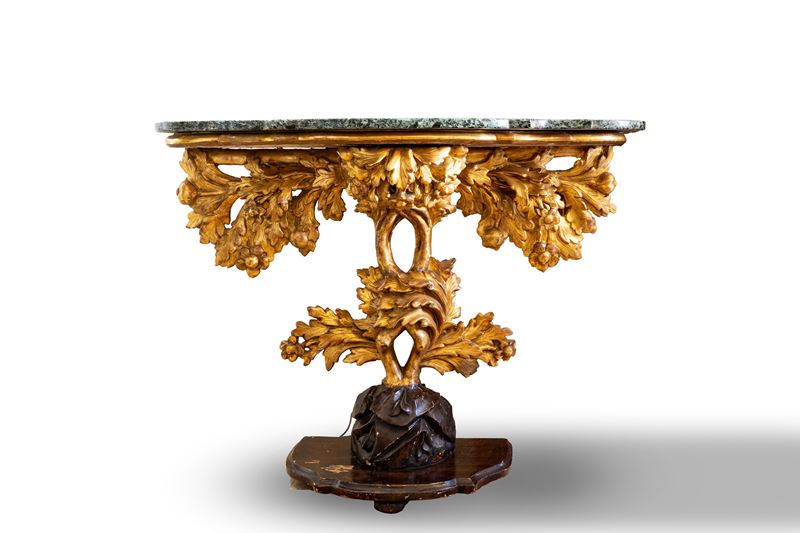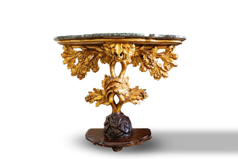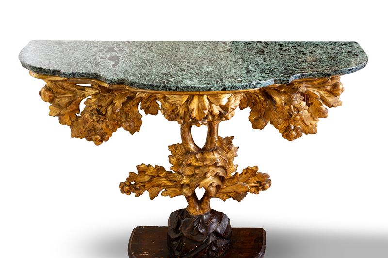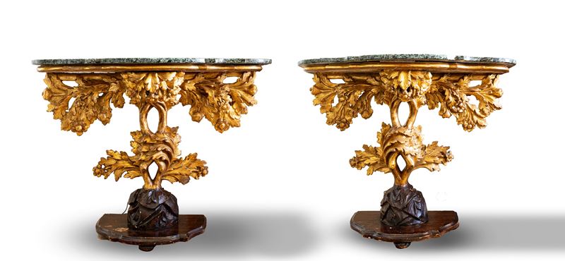 Coppia di consoles in legno scolpito, dipinto e dorato con piano in marmo verde. Roma, fine secolo XVII