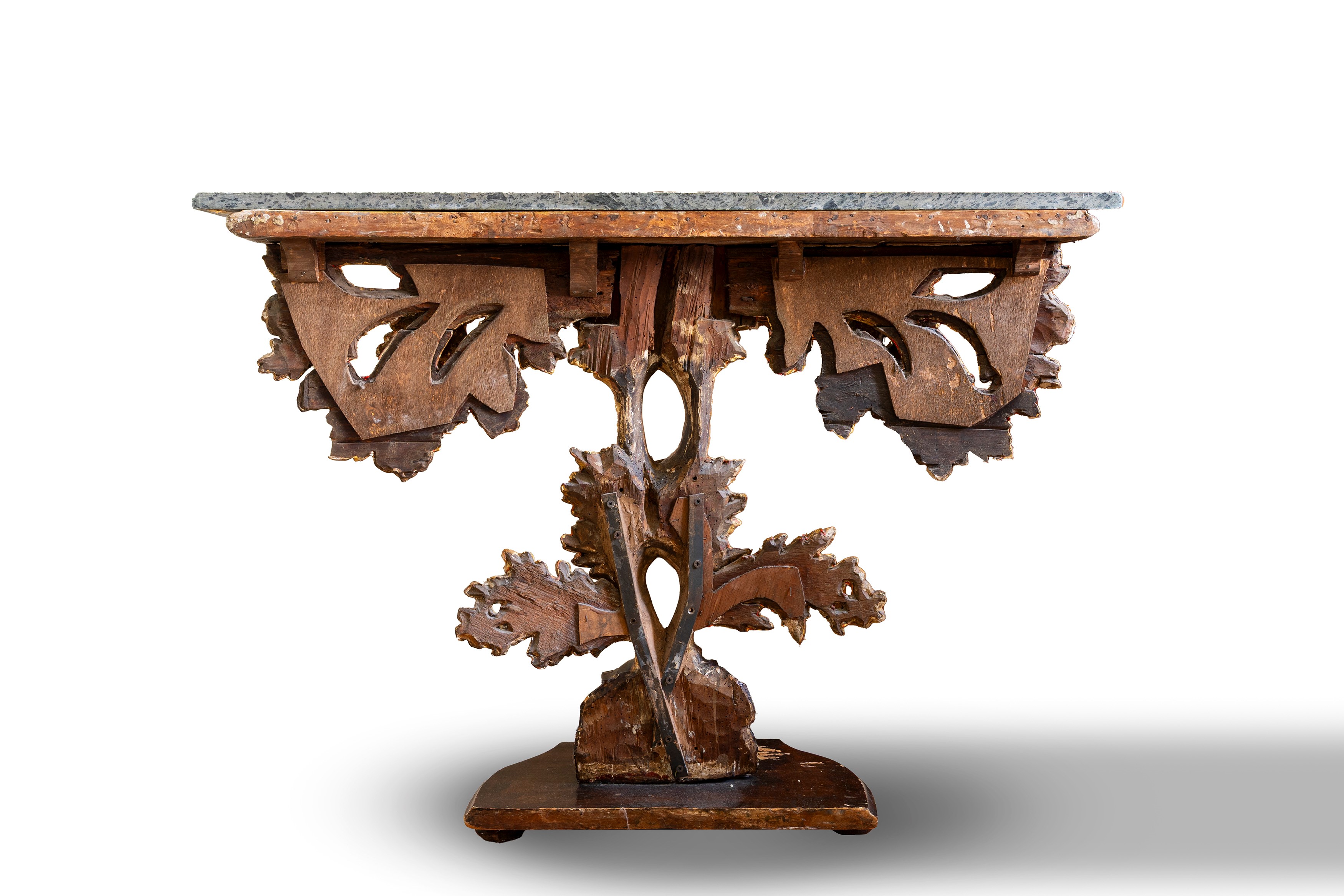 Sostegno naturalistico in forma di albero con rami di foglie e fiori. Restauri.