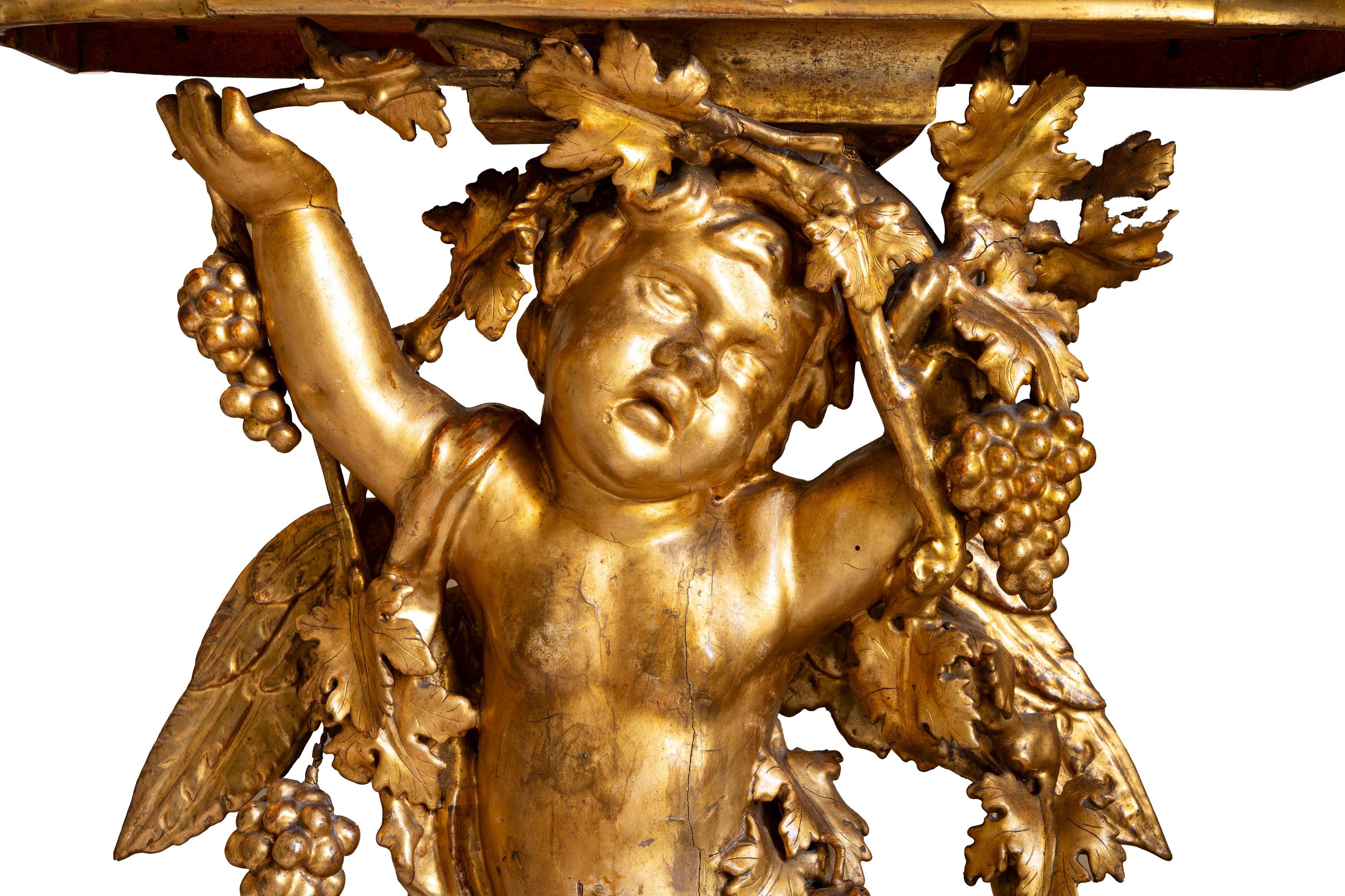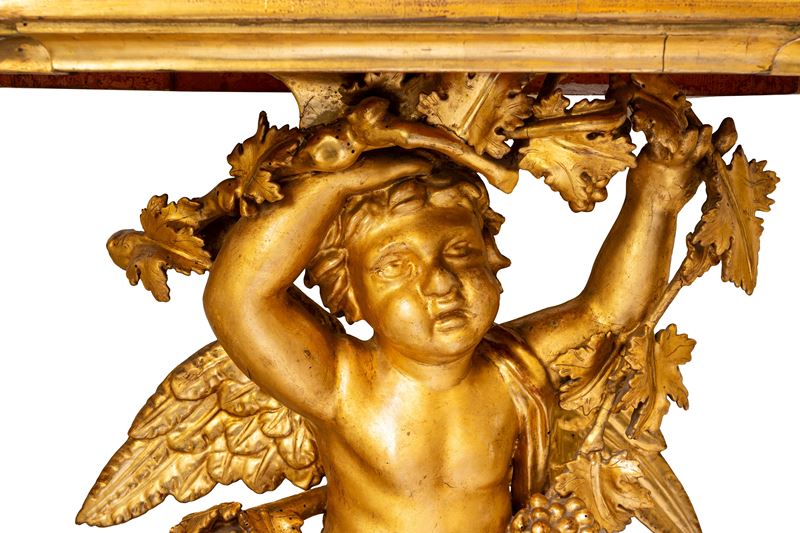 Coppia di consoles in legno scolpito e dorato con piano laccato a finto marmo. Secolo XVIII/XIX