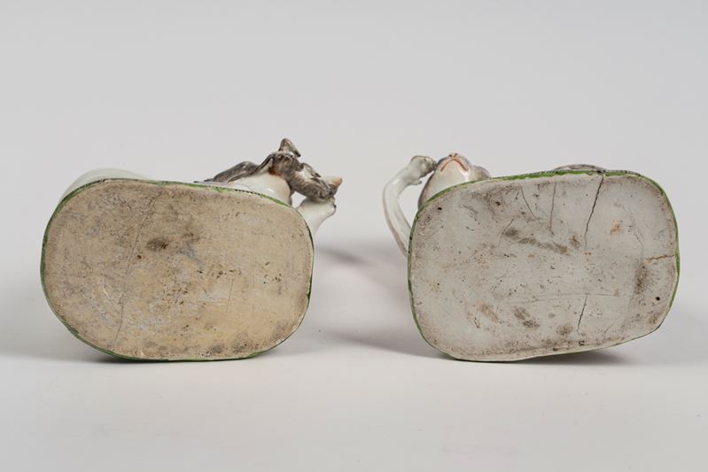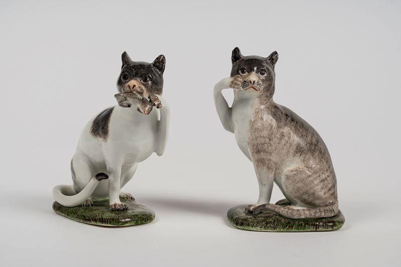 Coppia di figure in porcellana policroma raffiguranti due gatti seduti. Meissen, circa 1740, da un modello di J. J. Kaendler del 1736