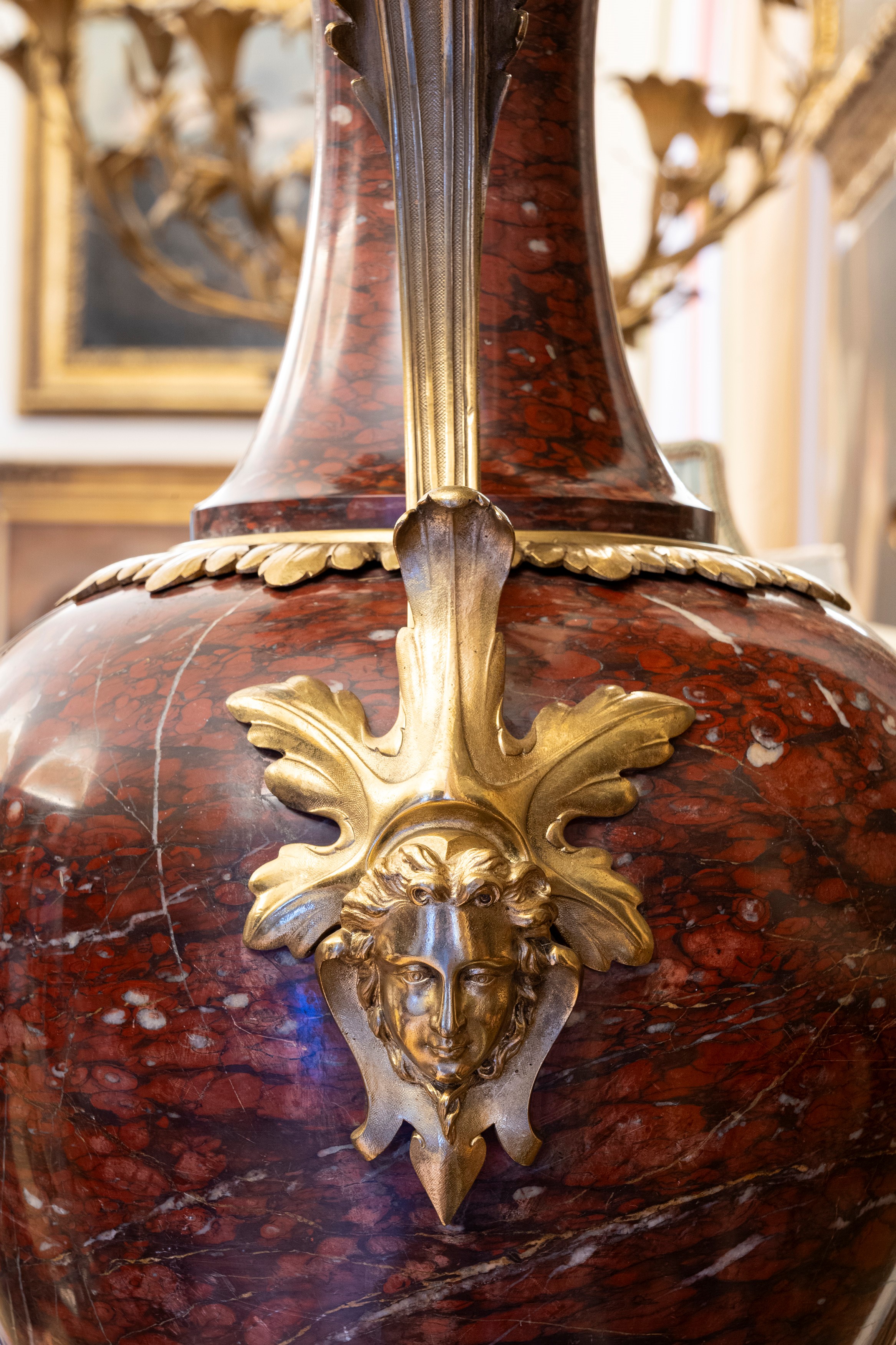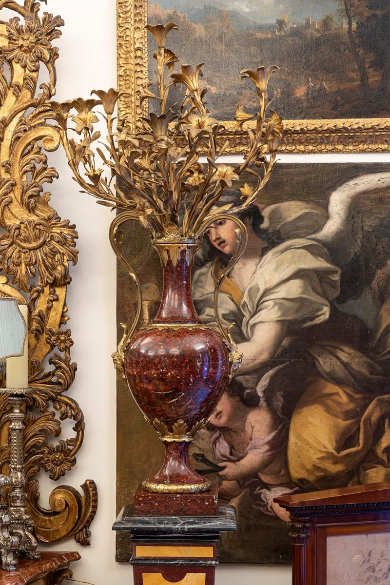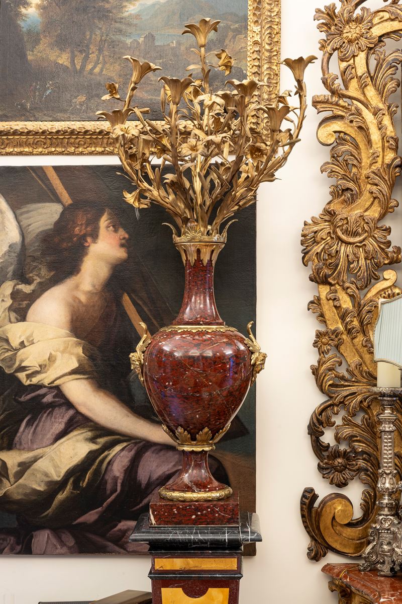 Coppia di grandi candelabri a dieci luci in marmo griotte rouge montato in bronzo dorato. Francia, ultimo quarto secolo XIХ