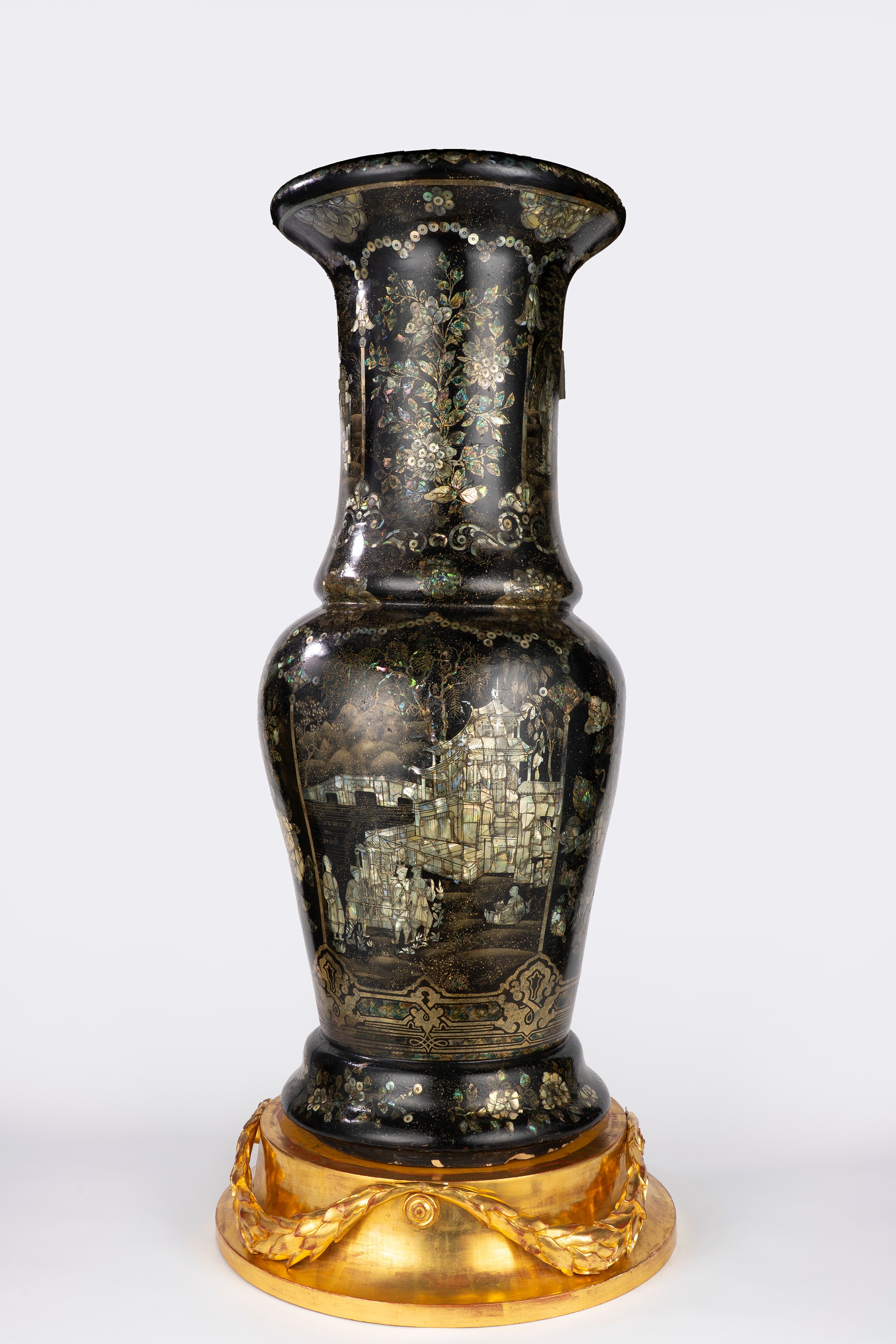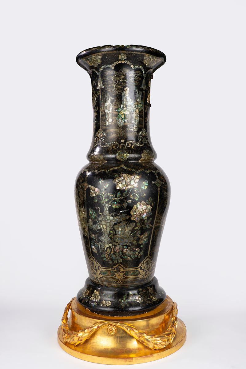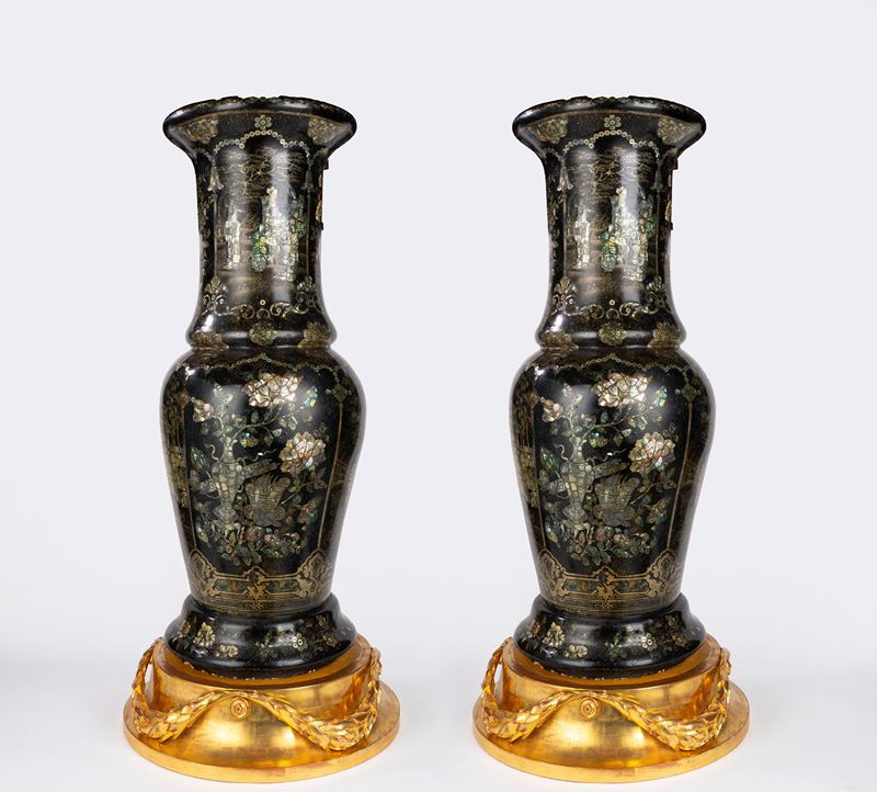 Coppia di grandi vasi cinesi a tromba in porcellana nera con intarsi in madreperla e metallo dorato. Fine secolo XIX