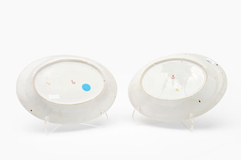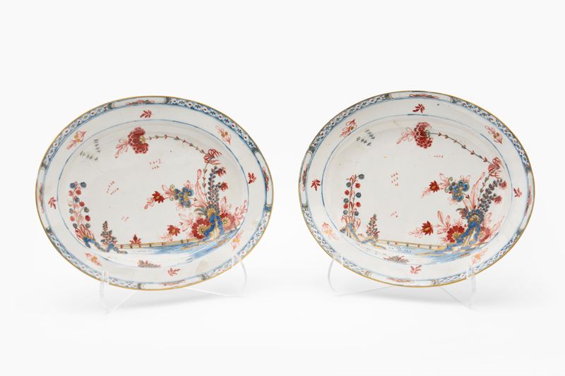 Coppia di piatti ovali in porcellana decorati all'orientale a motivi floreali e lumeggiati in oro. Manifattura di Cozzi, Venezia, seconda metà secolo XVIII.
