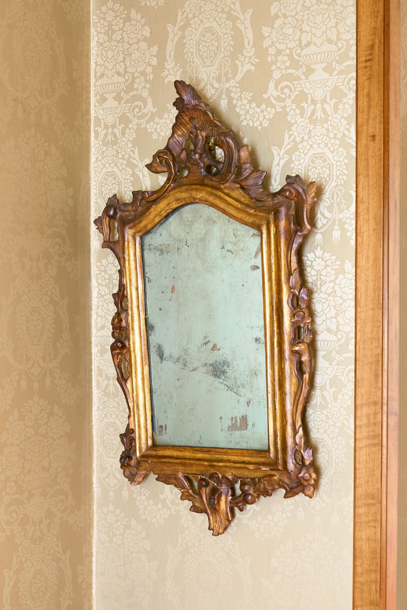 Fregi a volute fogliate, frutti e fiori, cimasa traforata a valva di conchiglia.