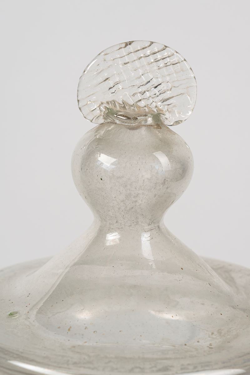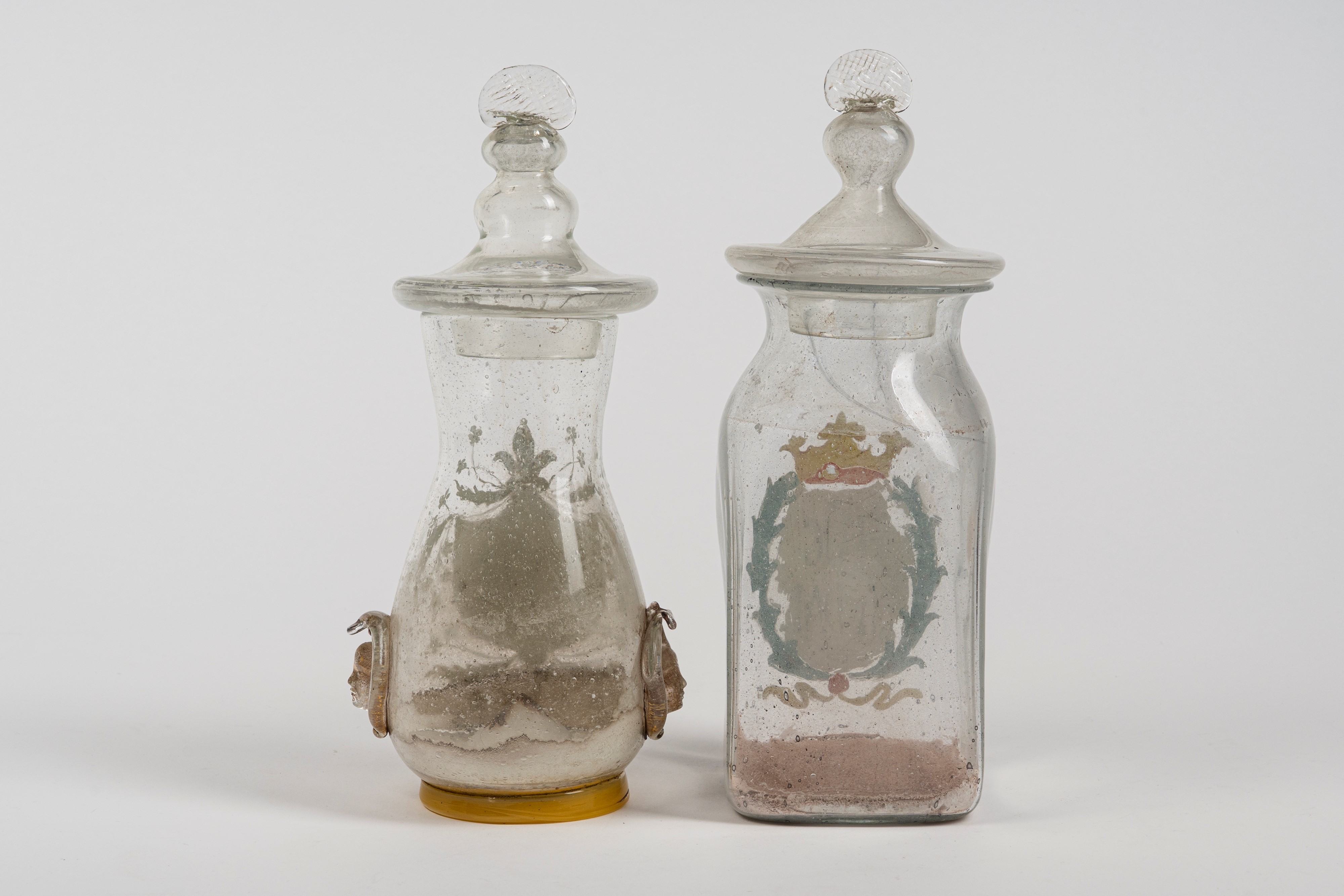 Due vasi da farmacia con coperchio in vetro incolore soffiato e dipinto, Venezia (?), fine secolo XVIII-XIX