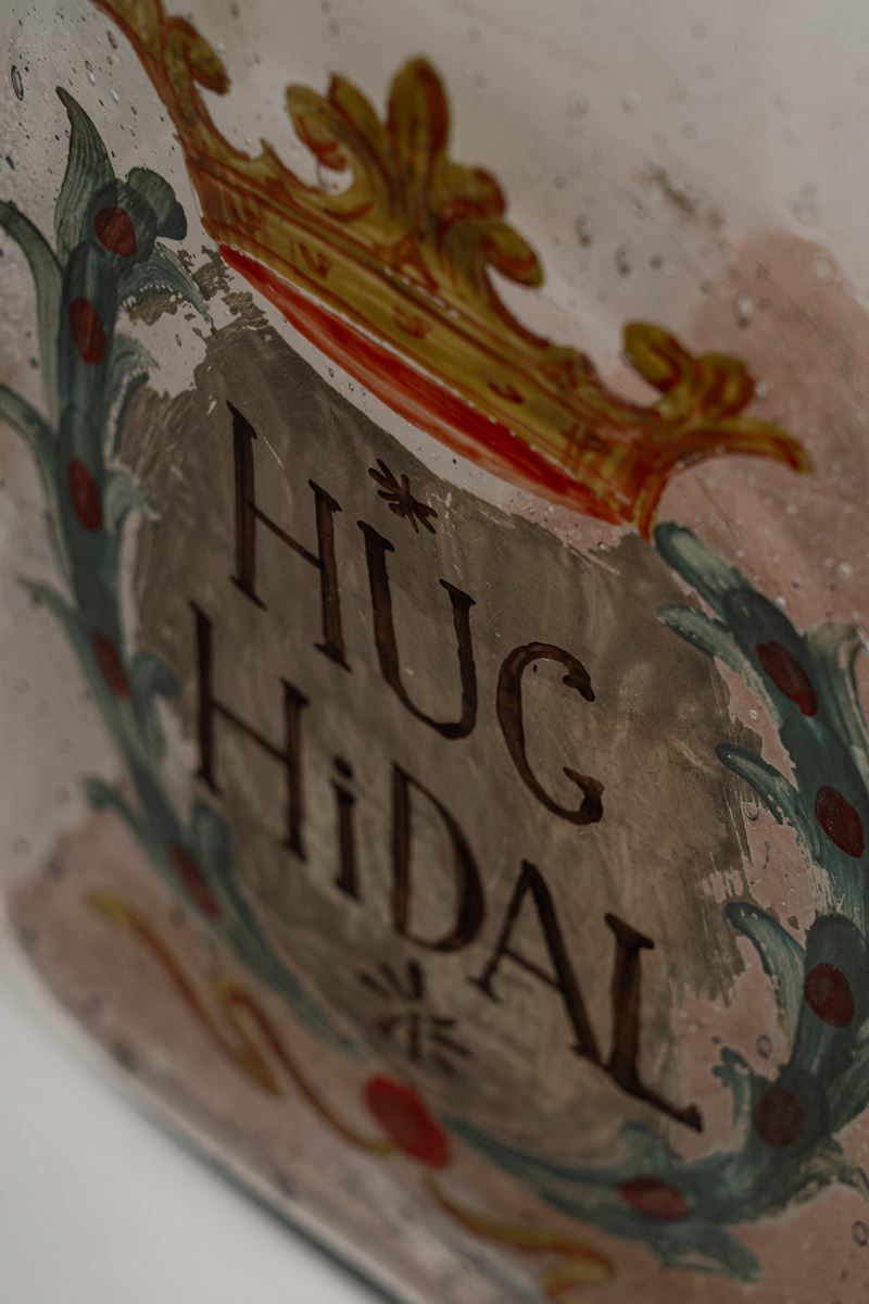 una biansata con volti femminili applicati e scudo dipinto con cifra romana, l'altro con stemma e scritta HUG HiDAL.