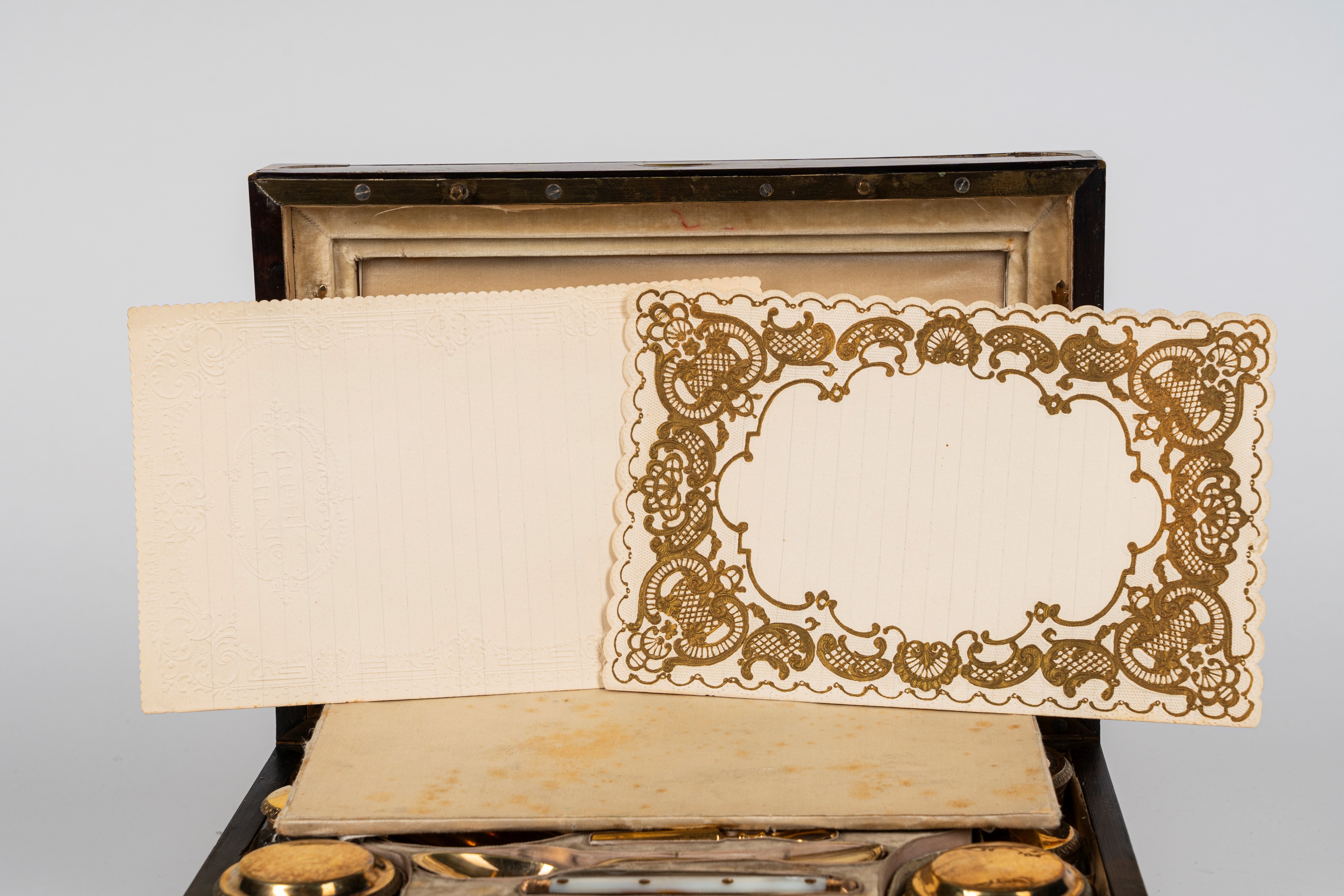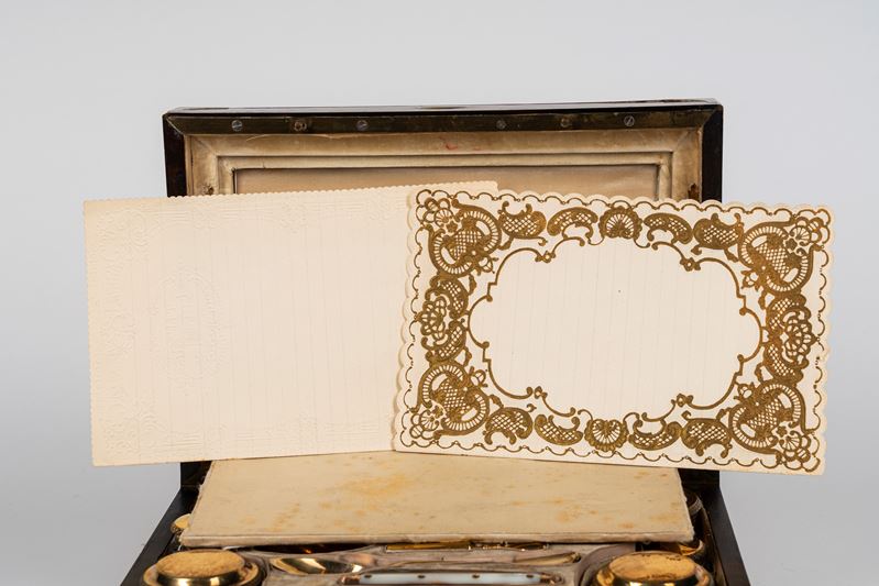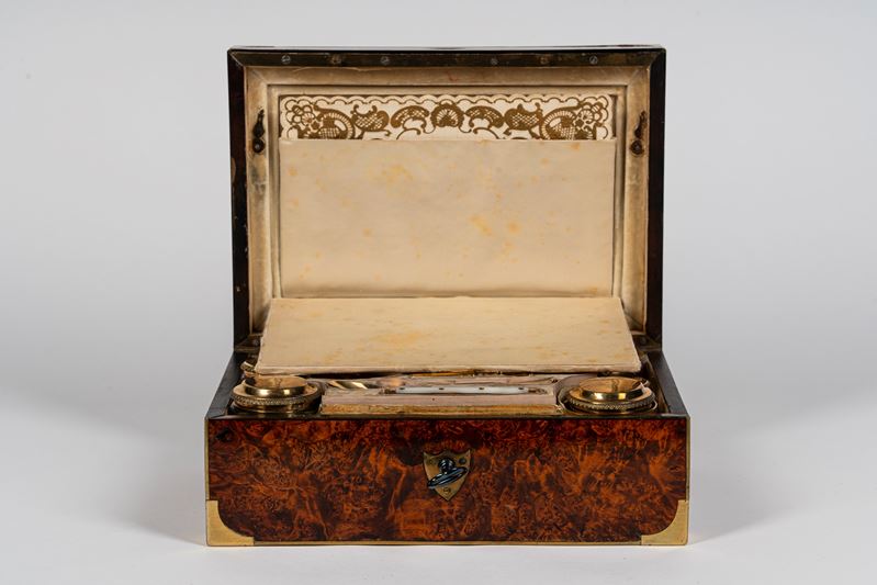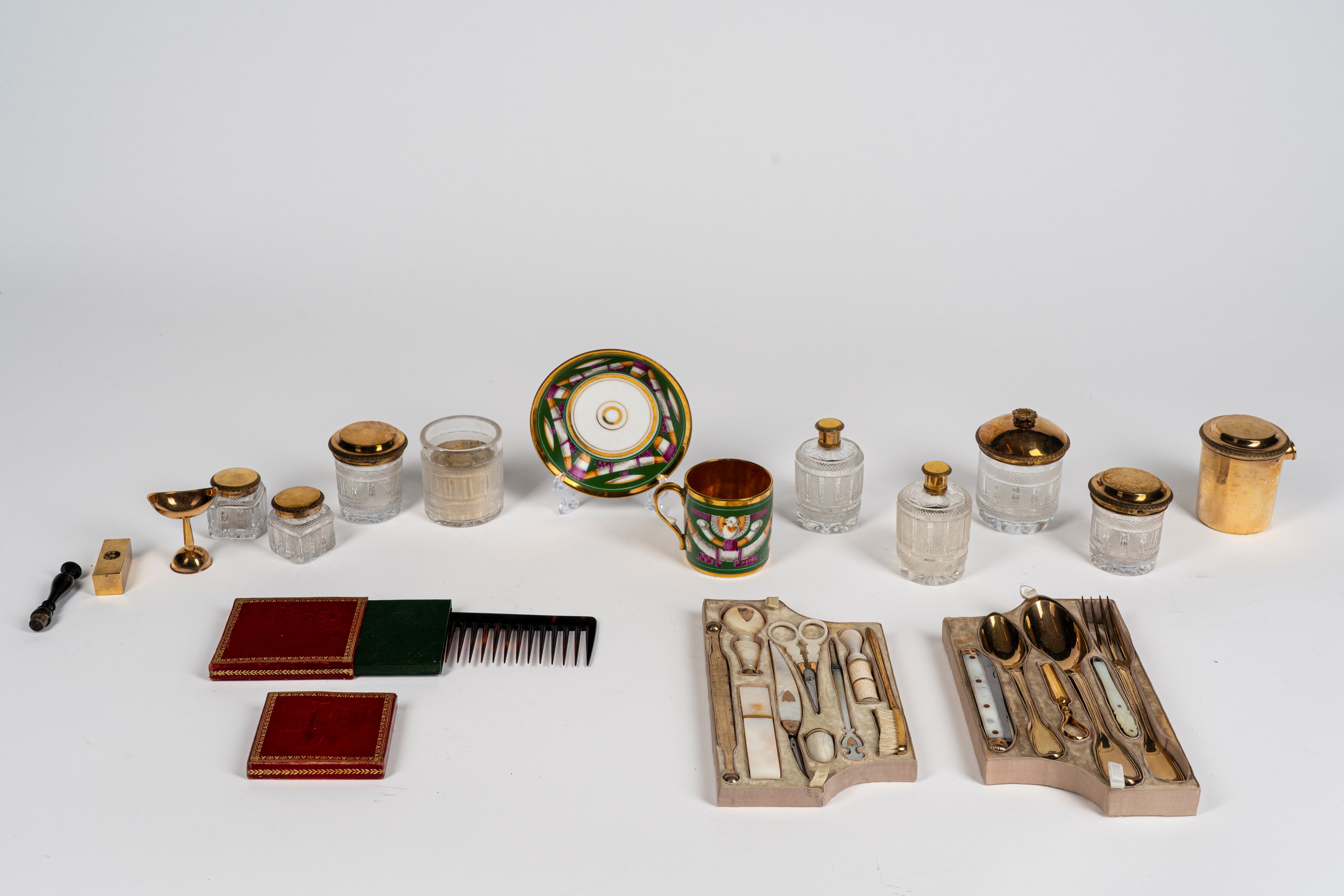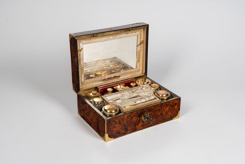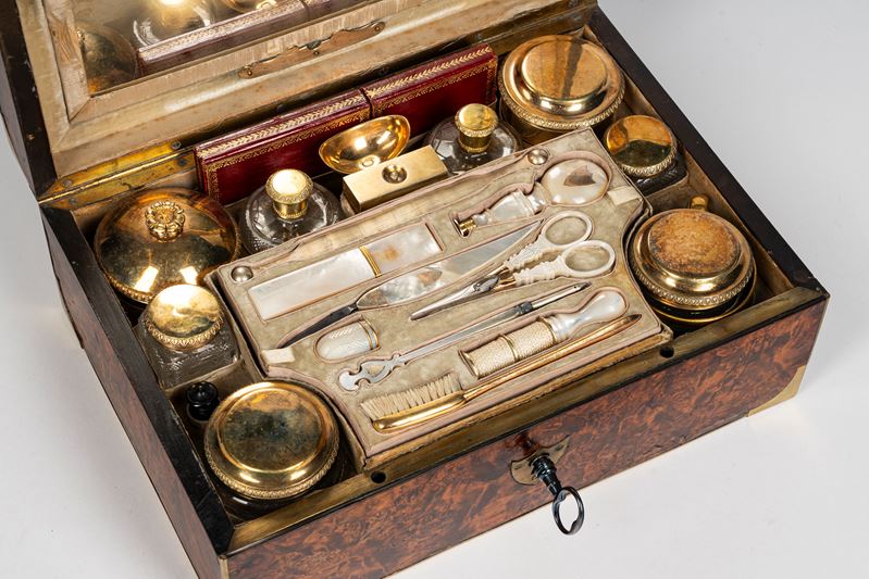 all'interno un set di posate in vermeil con due taglierini in madreperla, un set da toilette in vermeil e madreperla, una tazzina con piattino in porcellana, otto contenitori in cristallo e vermeil, un piccolo calice, un pettine in tartaruga entro custodia. All'interno del coperchio specchio apribile celante porta lettera.