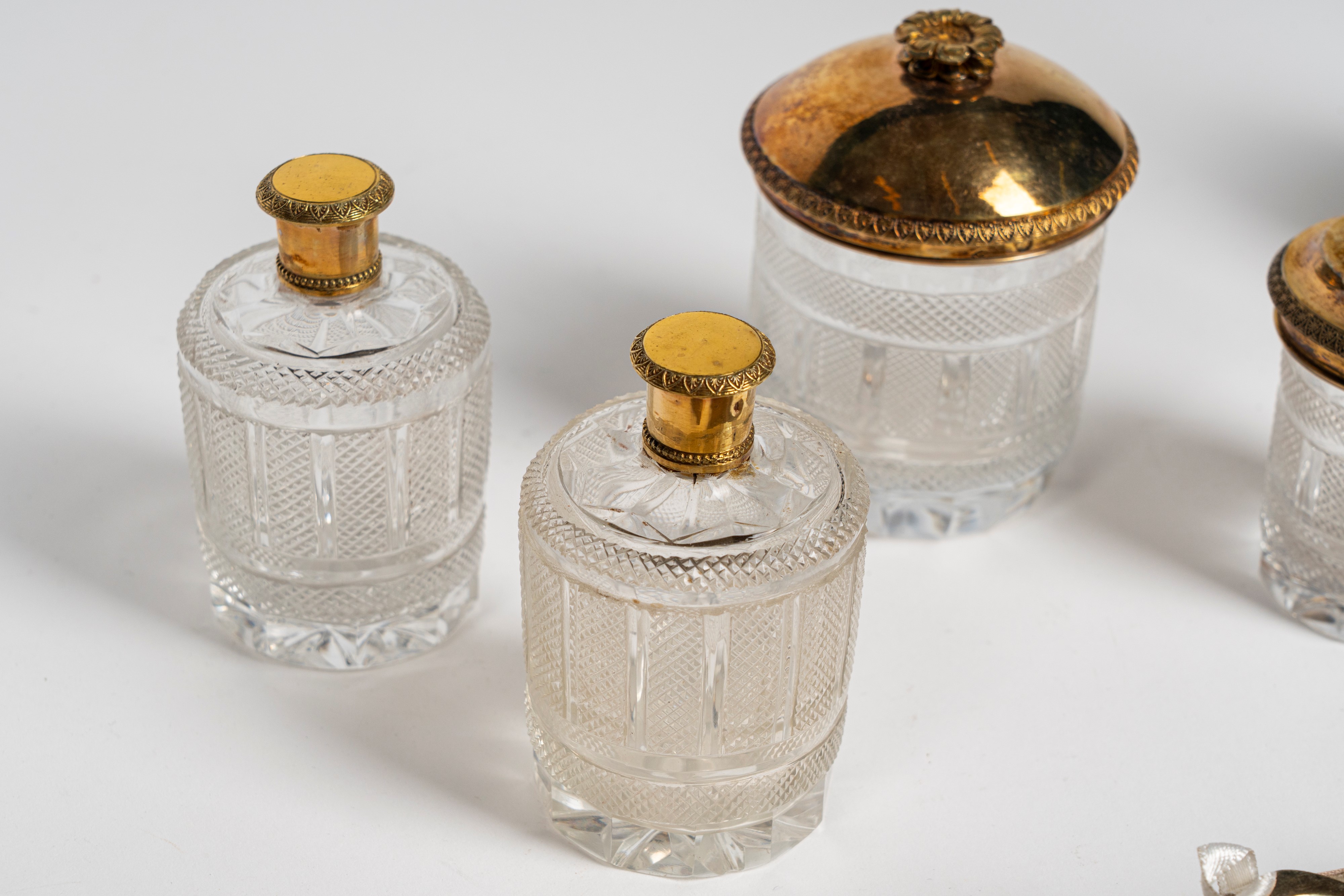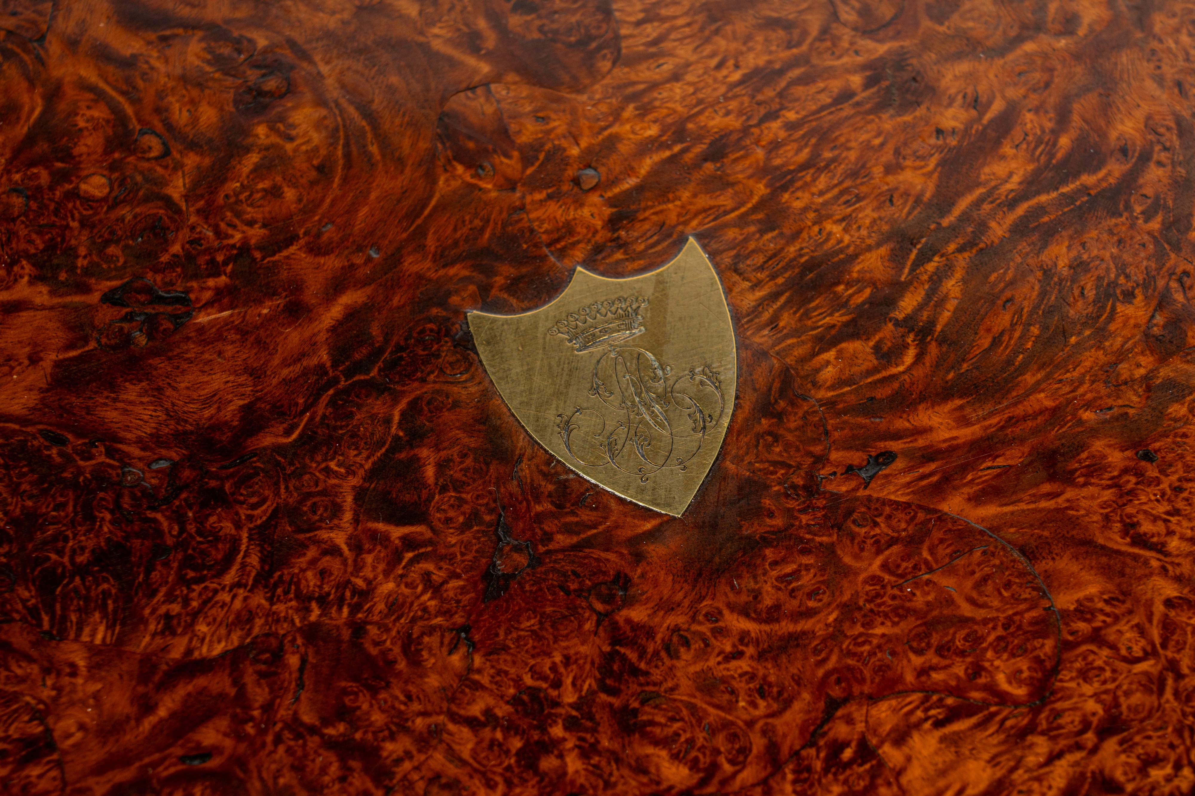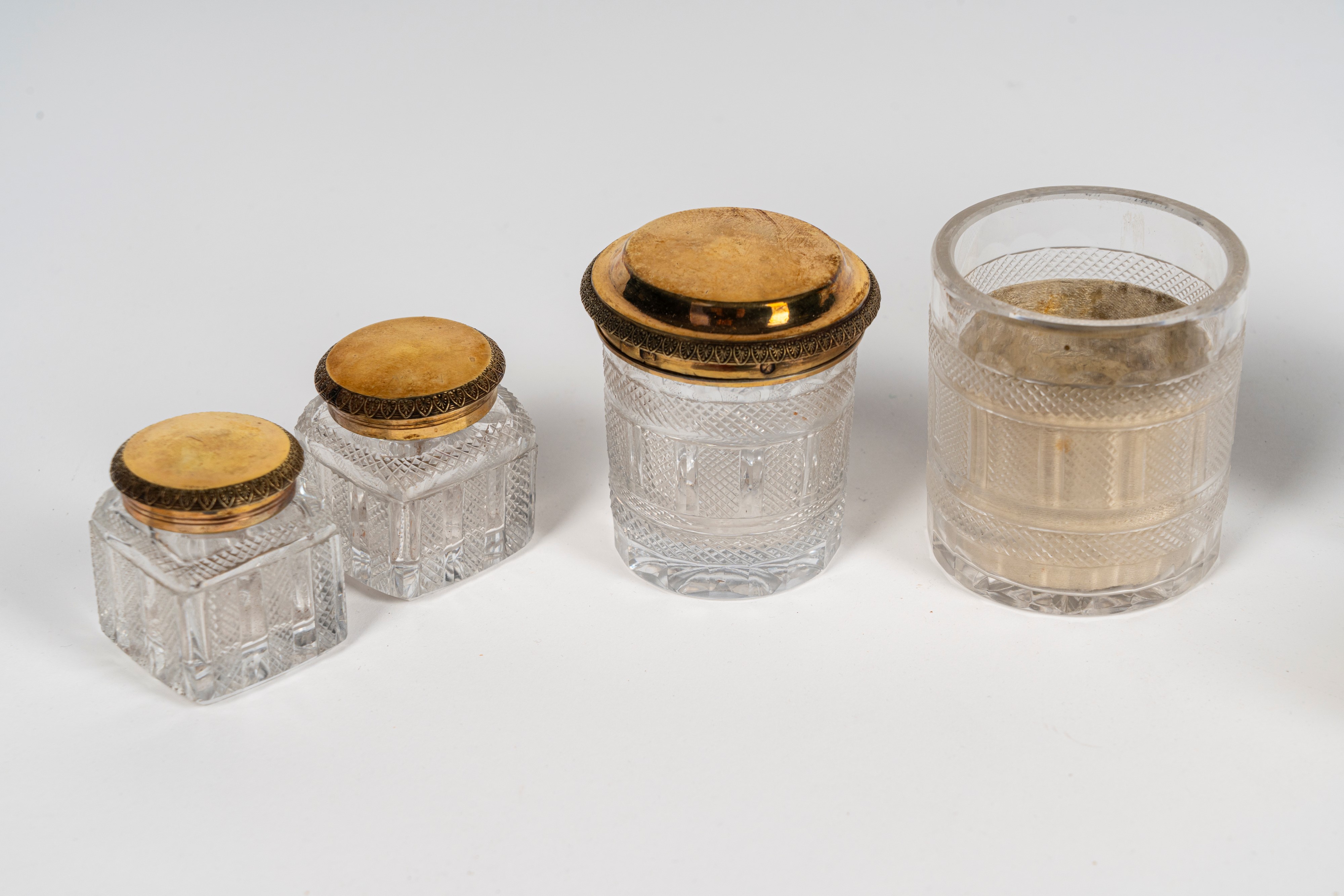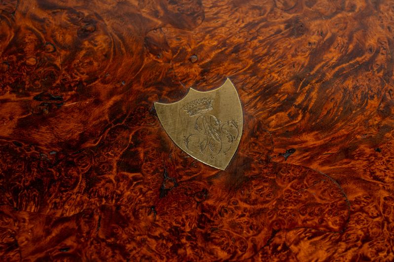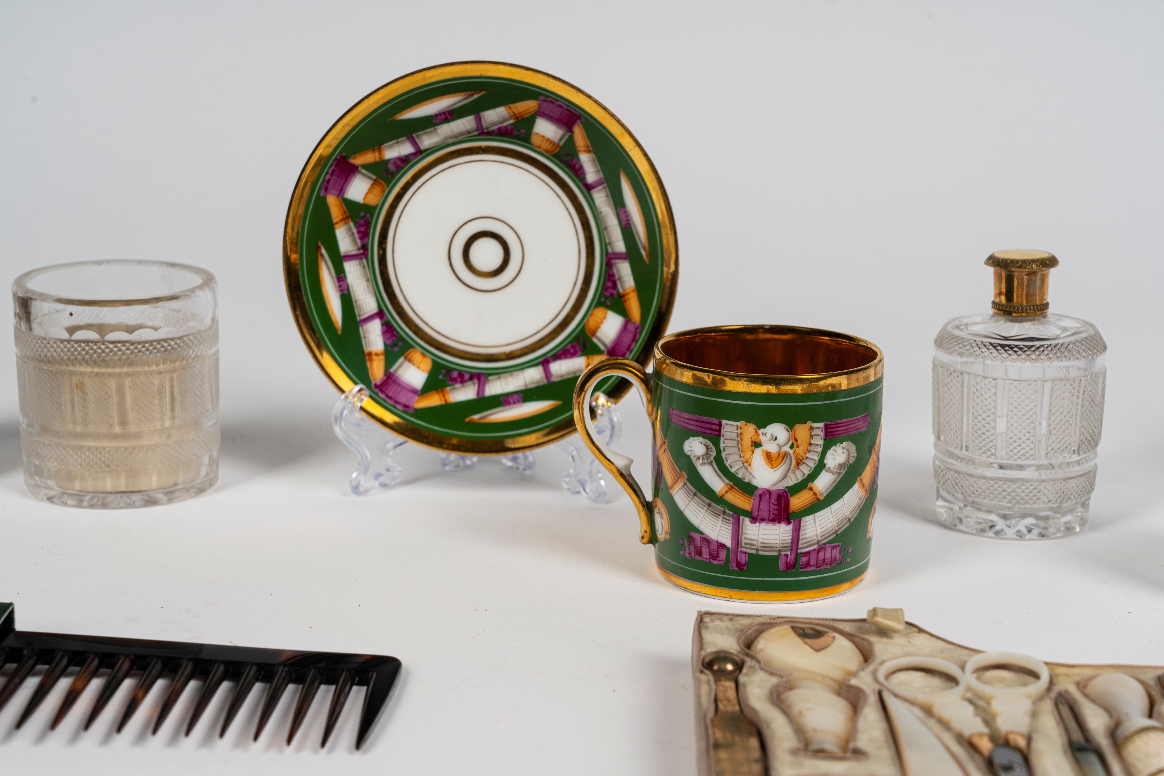 all'interno un set di posate in vermeil con due taglierini in madreperla, un set da toilette in vermeil e madreperla, una tazzina con piattino in porcellana, otto contenitori in cristallo e vermeil, un piccolo calice, un pettine in tartaruga entro custodia. All'interno del coperchio specchio apribile celante porta lettera.