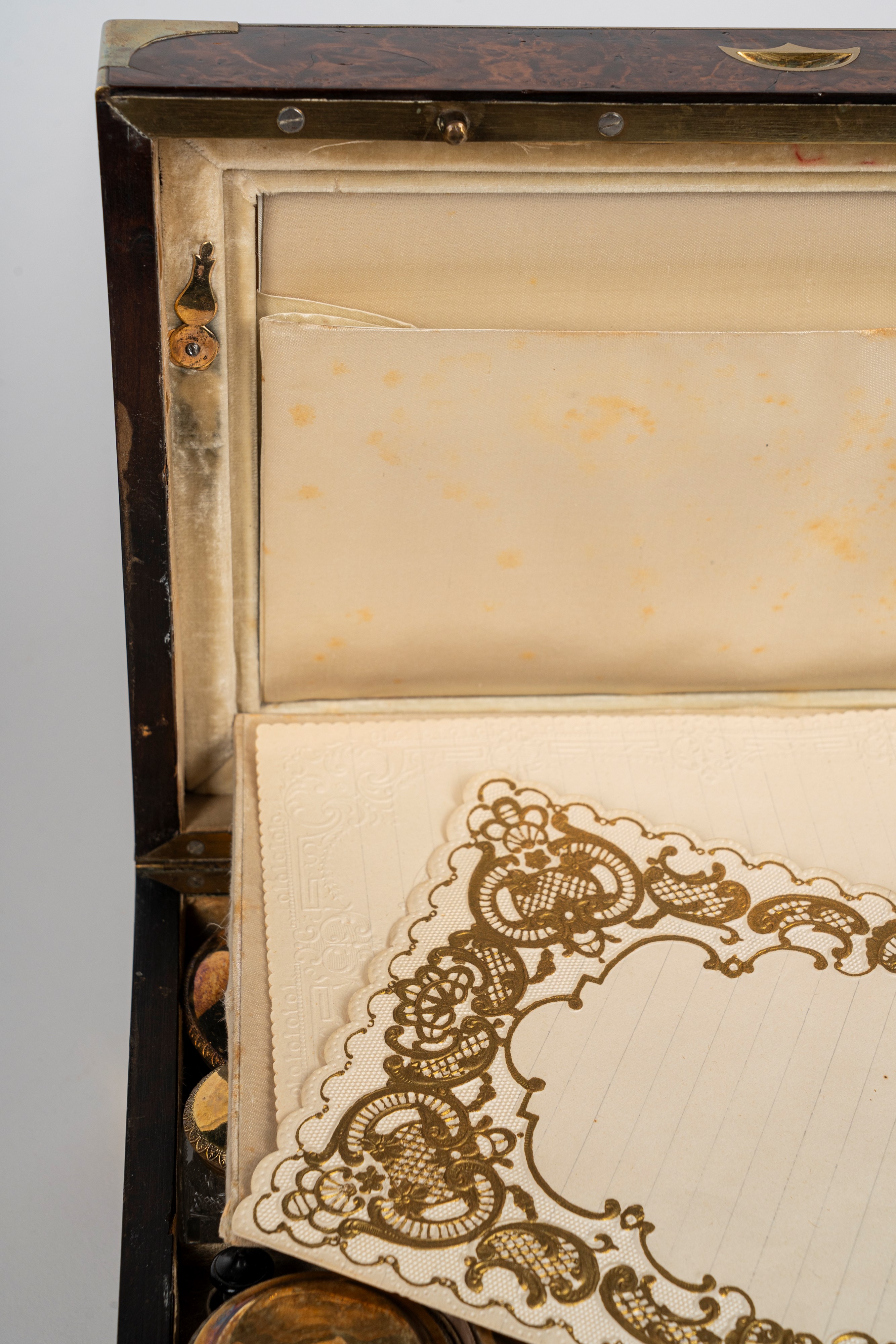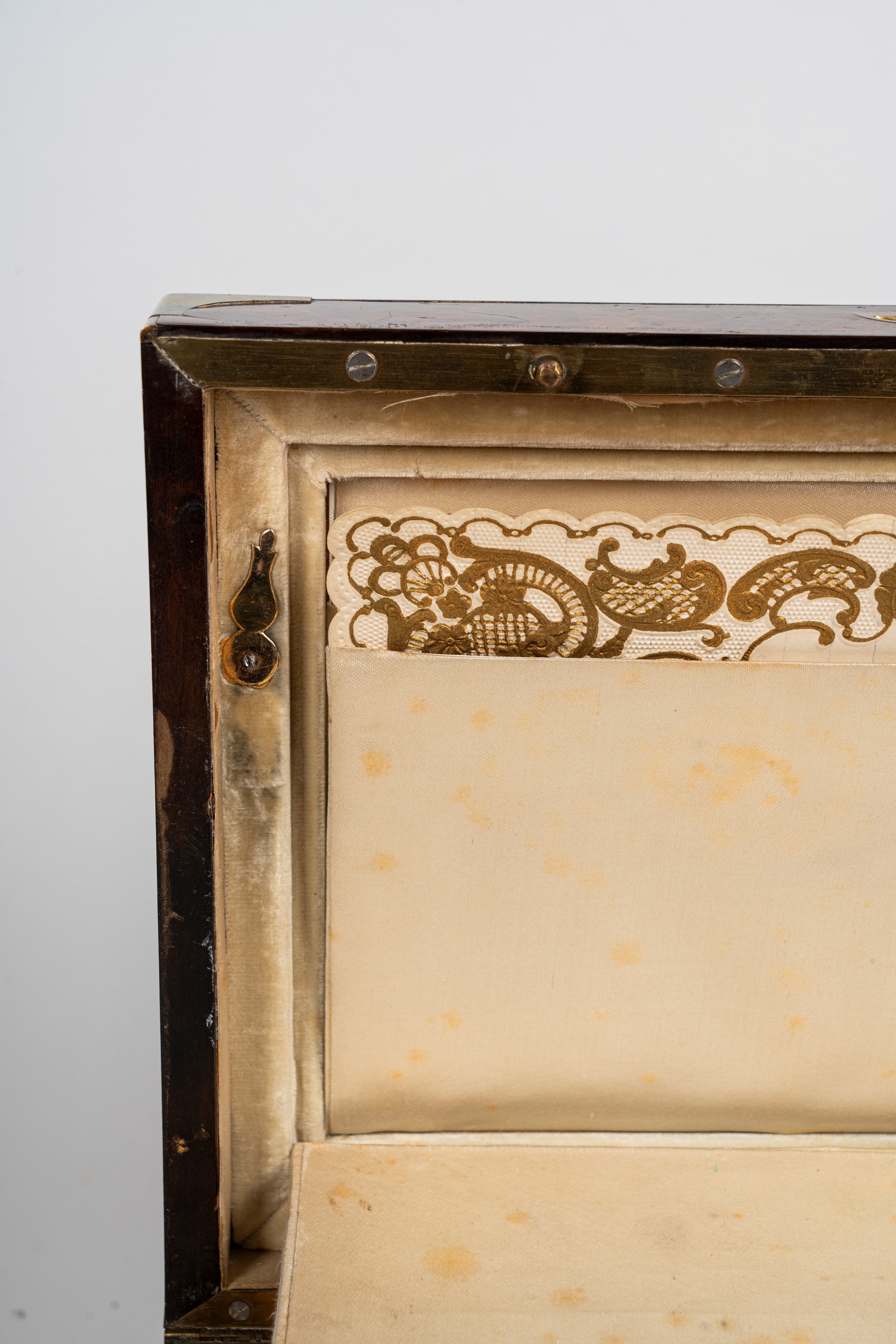 Grande necessaire da viaggio entro scatola lastronata con inserti in ottone. Francia, inizio secolo XIX