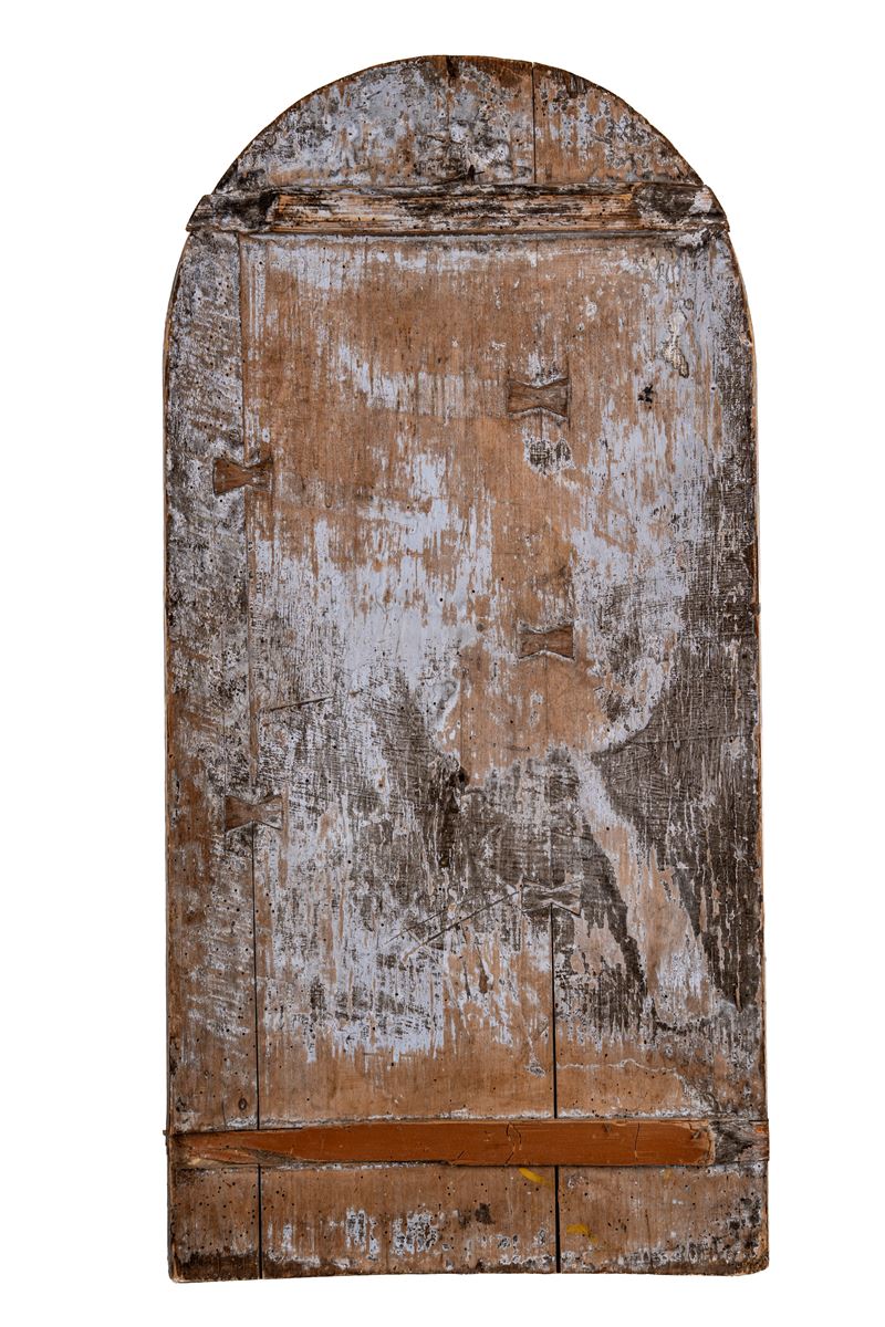 Tavola di forma centinata nella parte superiore, fondo inciso a motivi stilizzati e floreali, il santo stante a figura intera con libro aperto tra le mani, il Prologo del Vangelo di Giovanni (lievi difetti e restauri)
