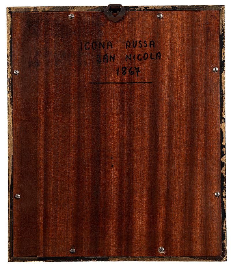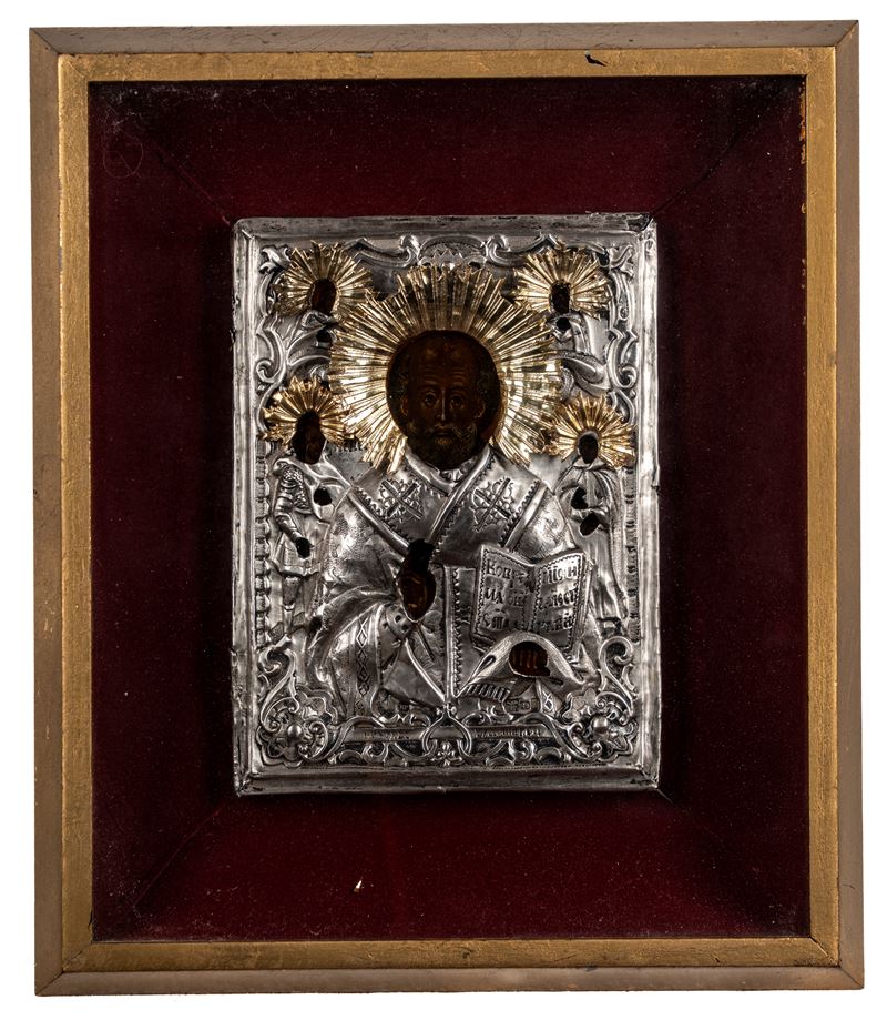 Icona raffigurante San Nicola Taumaturgo con riza in argento sbalzato e dorato. Russia, XIX secolo