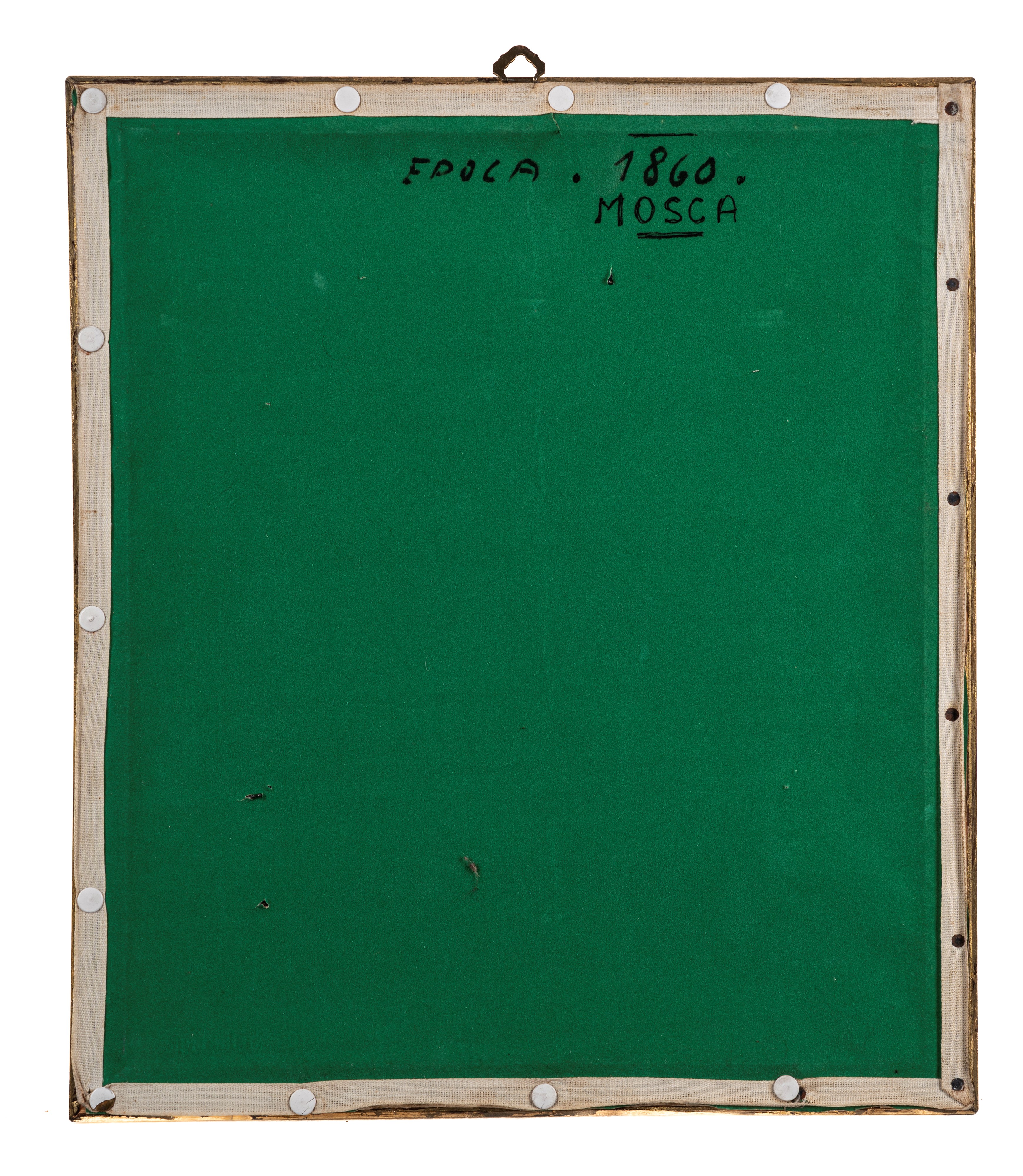 Icona raffigurante San Nicola Taumaturgo con riza in argento sbalzato e dorato. Russia, XIX secolo